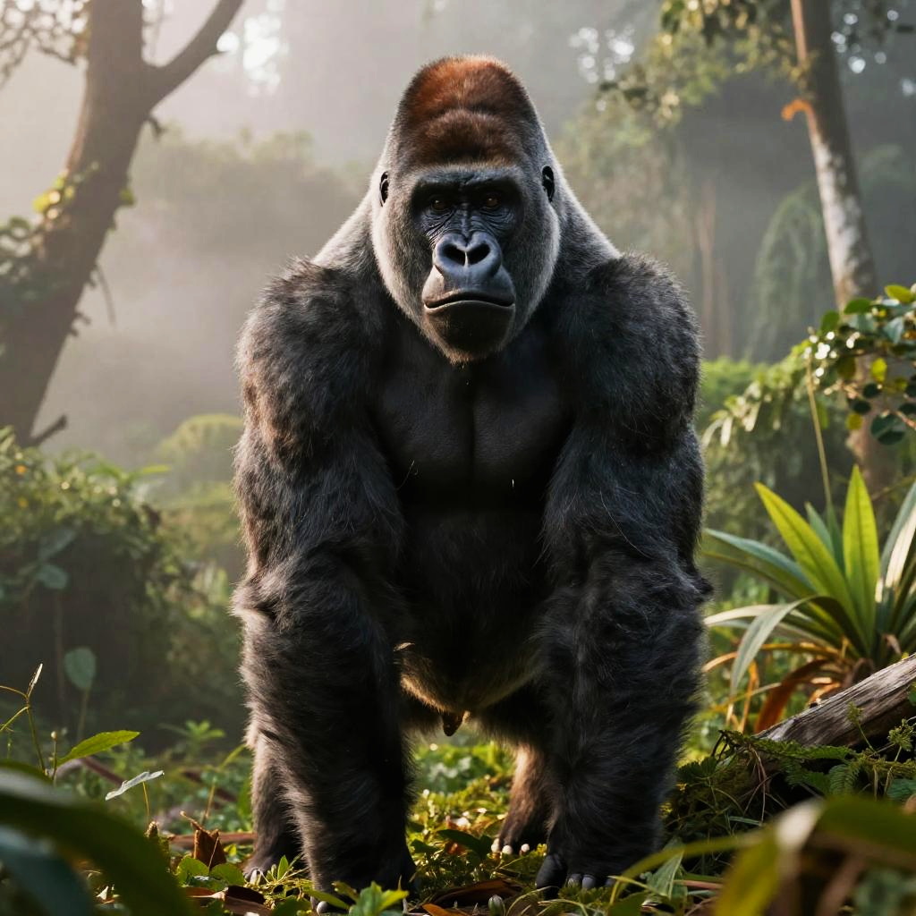 Powerful silverback gorilla standing tall on lush tropical jungle at early morning mist, in ultra-detailed photorealistic rendering; heroic stance, warm rim light, detailed textures and fine fur/skin, expressive eyes, atmospheric perspective, low-angle dramatic view, leading lines, balanced rule-of-thirds composition, soft background separation, high dynamic range feel, ultra sharp subject, natural color grade, subtle haze, microcontrast on edges, immersive realism, SDXL, 8k resolution