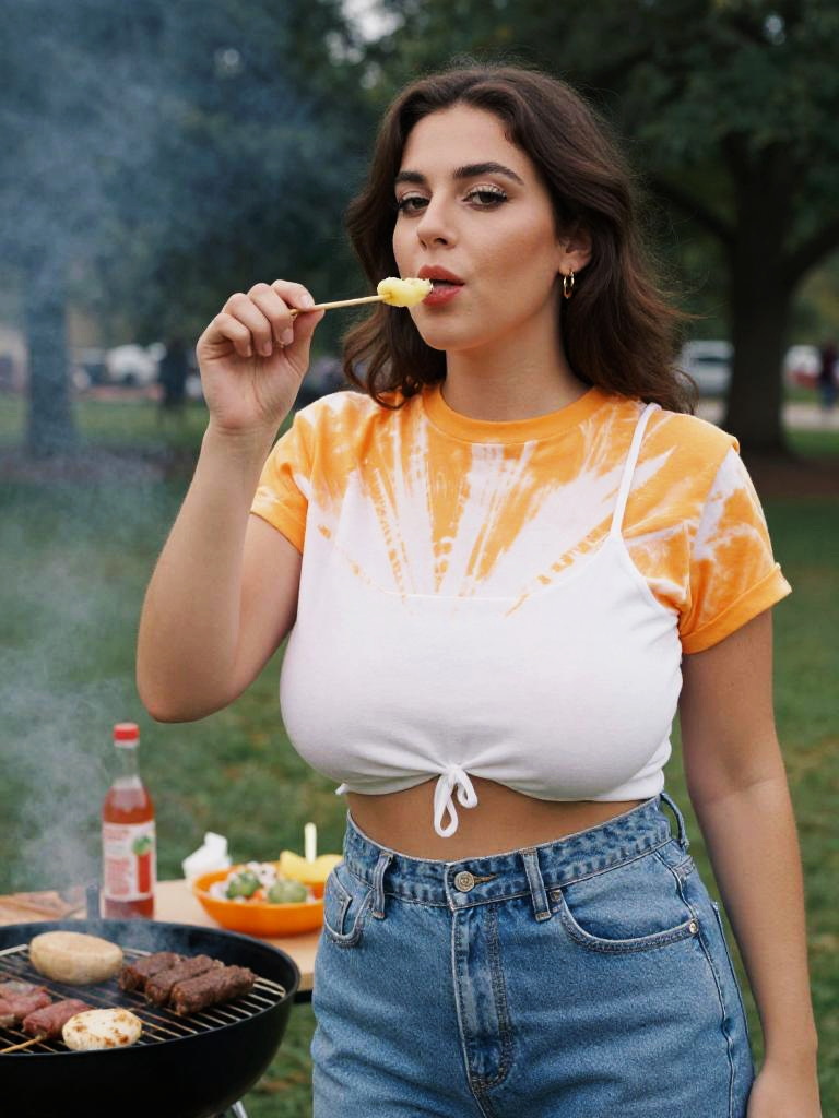 A Stocky woman in casual streetwear, wearing a cropped tie-dye T-shirt in orange and white and high-waisted blue denim jeans, captured in the vibrant visual style of anscochrome analog film, enjoying a BBQ Gathering at the Park. Sexy. Pretty face and beаutiful eyes. Big breasts