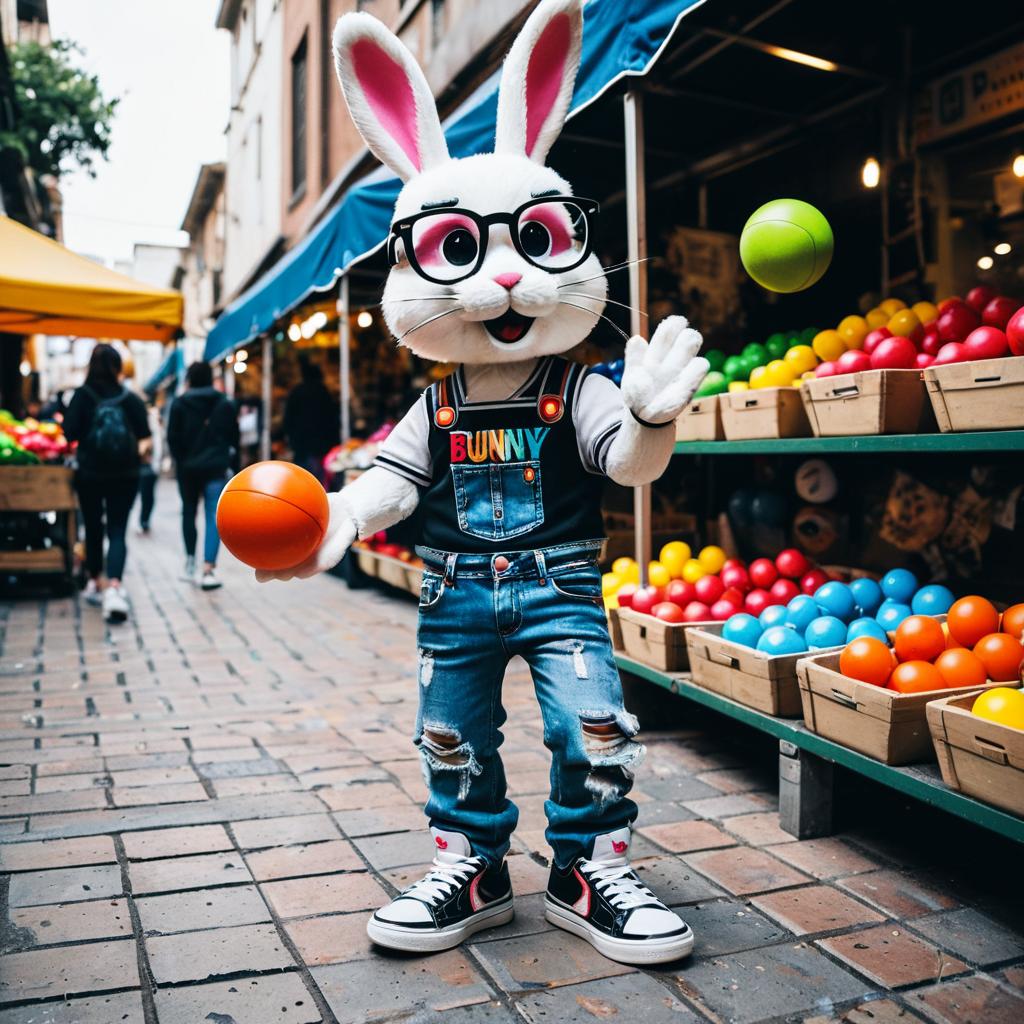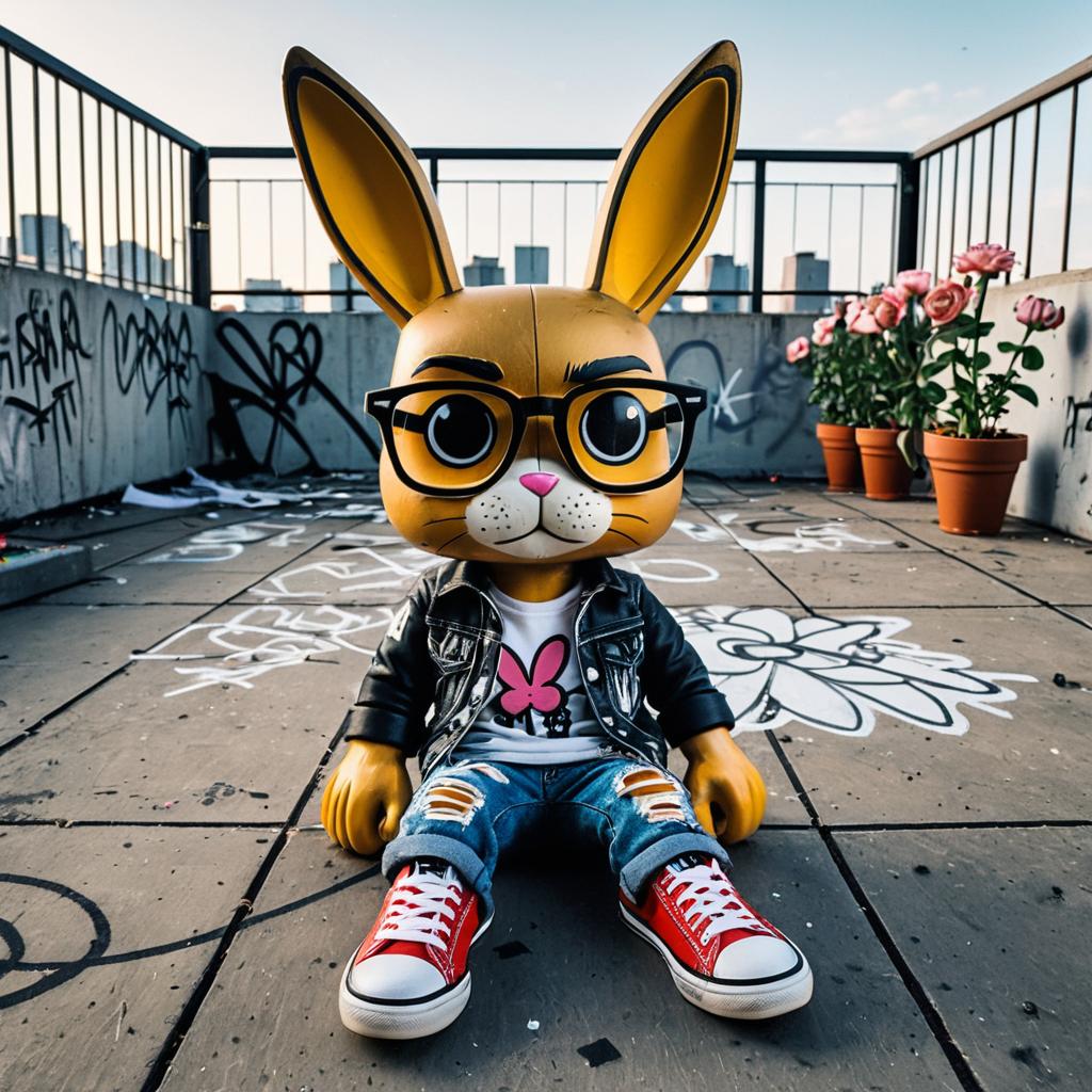 Funko Pop bunny carrying a backpack and pointing, with glasses, ripped jeans, sports shoes, in city rooftop, cinematic lighting, parquet concrete floors with flower pots, ultra-realistic editorial style.