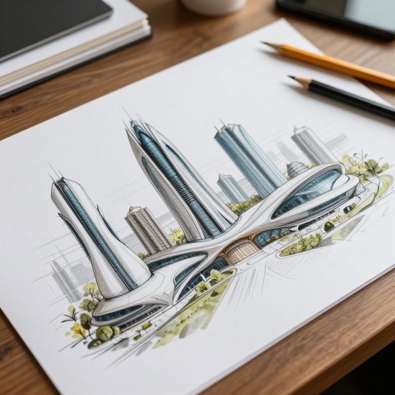 A detailed architectural drawing of futuristic buildings on a desk with pencils and papers.