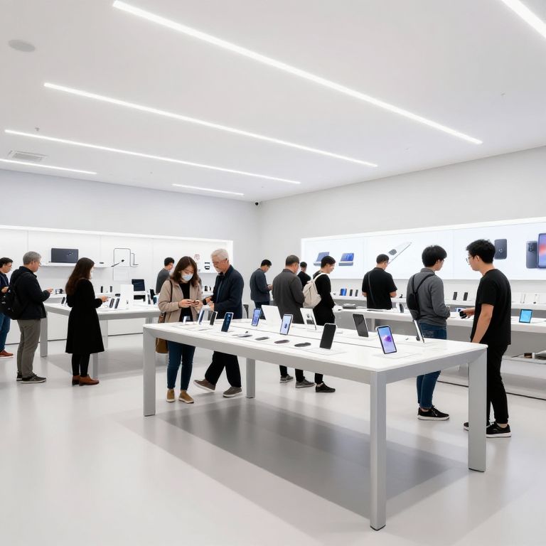 A modern retail store with minimalist design, bright lighting, and customers examining the latest technology gadgets