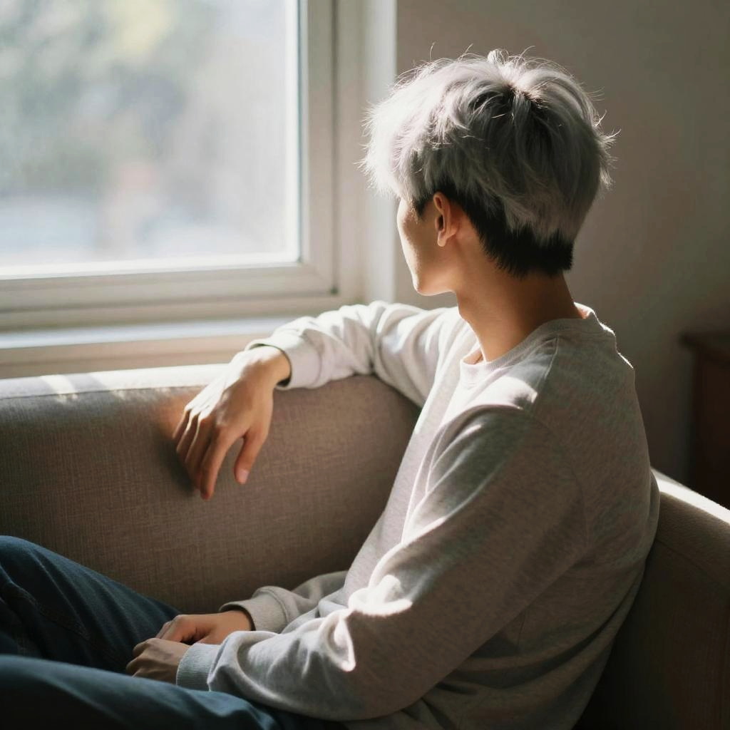 Solo, male focus, 1boy, indoors, sitting, couch, short hair, window, white hair, grey hair, long sleeves, from behind, sunlight, facing away, from side