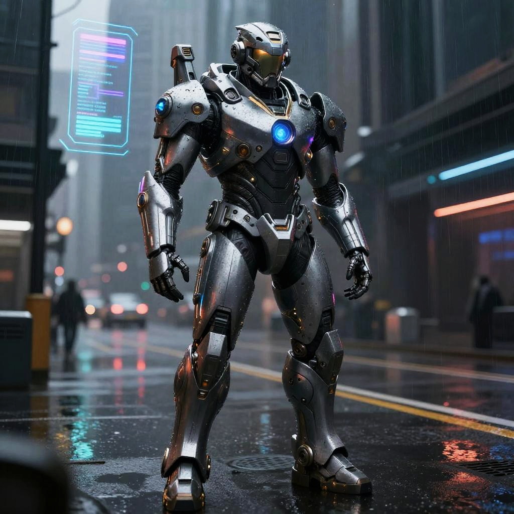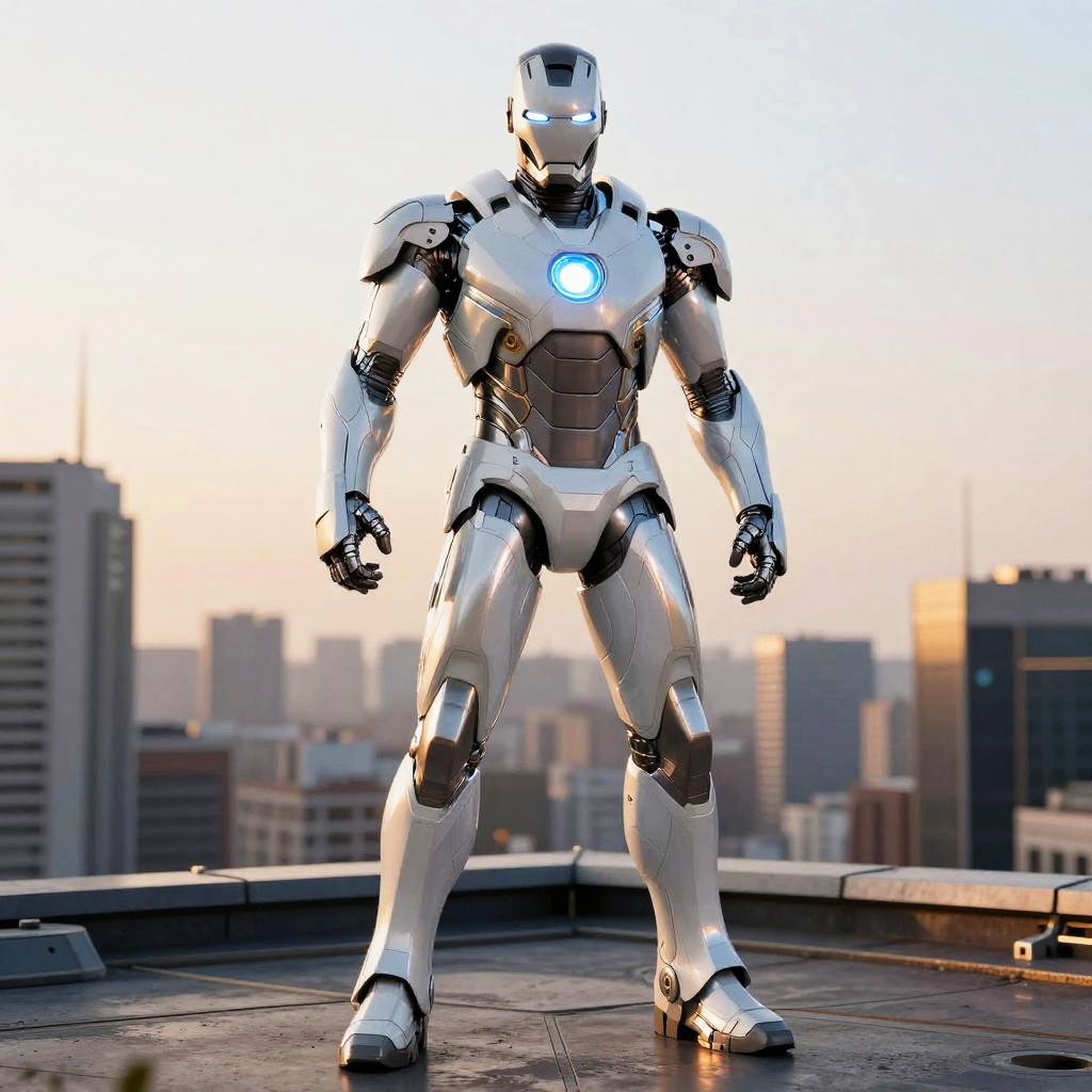 A highly detailed CGI image of a white, futuristic, humanoid robot with glowing blue eyes and orange circular lights on its chest. The robot has a sleek, armored design with segmented plates, black joints, and metallic textures. It stands in a futuristic, sterile lab with blurred, glowing blue and white screens in the background. The robot's design is reminiscent of Iron Man, with a combination of smooth and jagged surfaces, and it exudes a powerful, advanced presence.