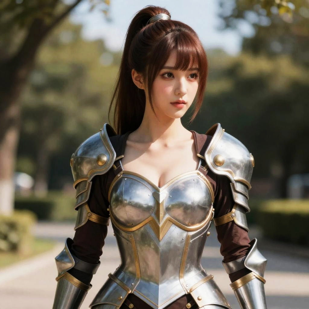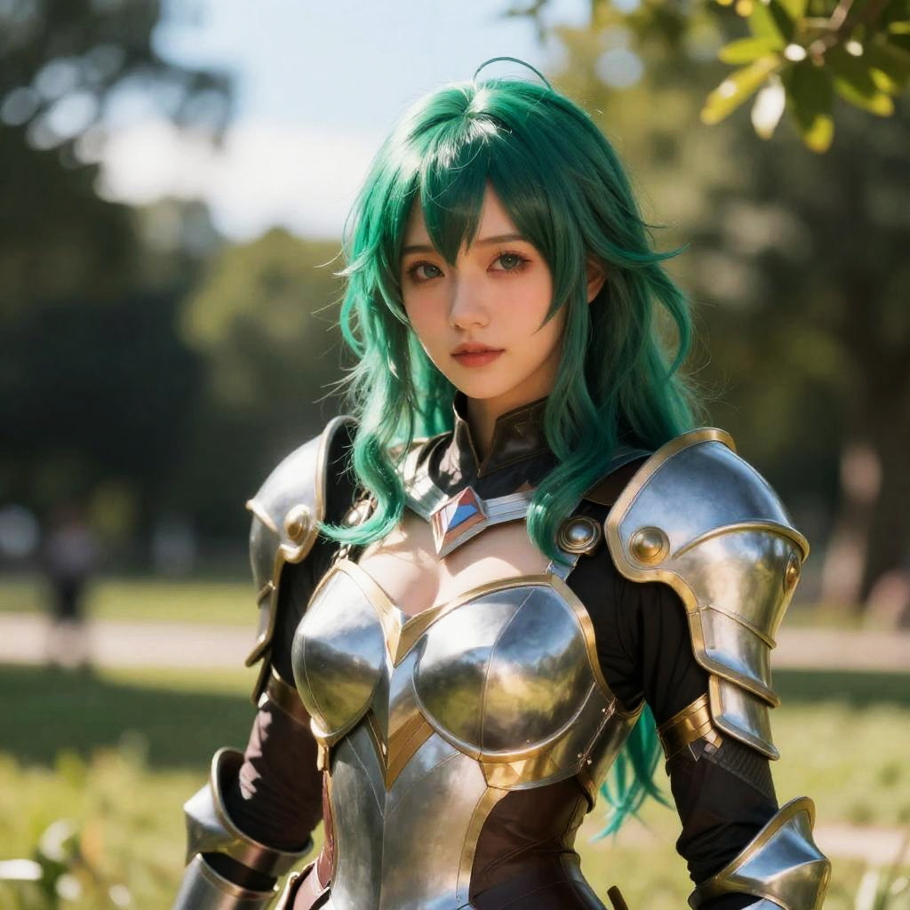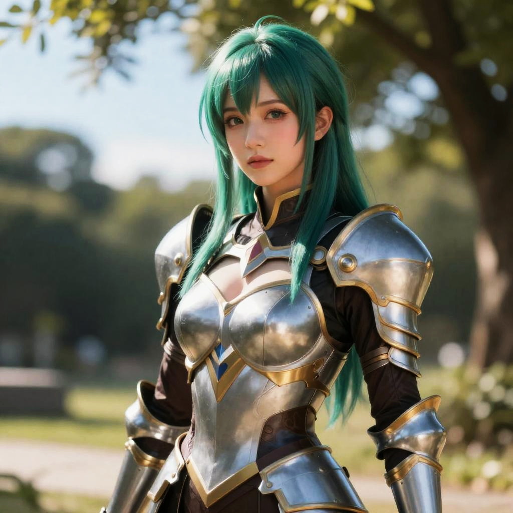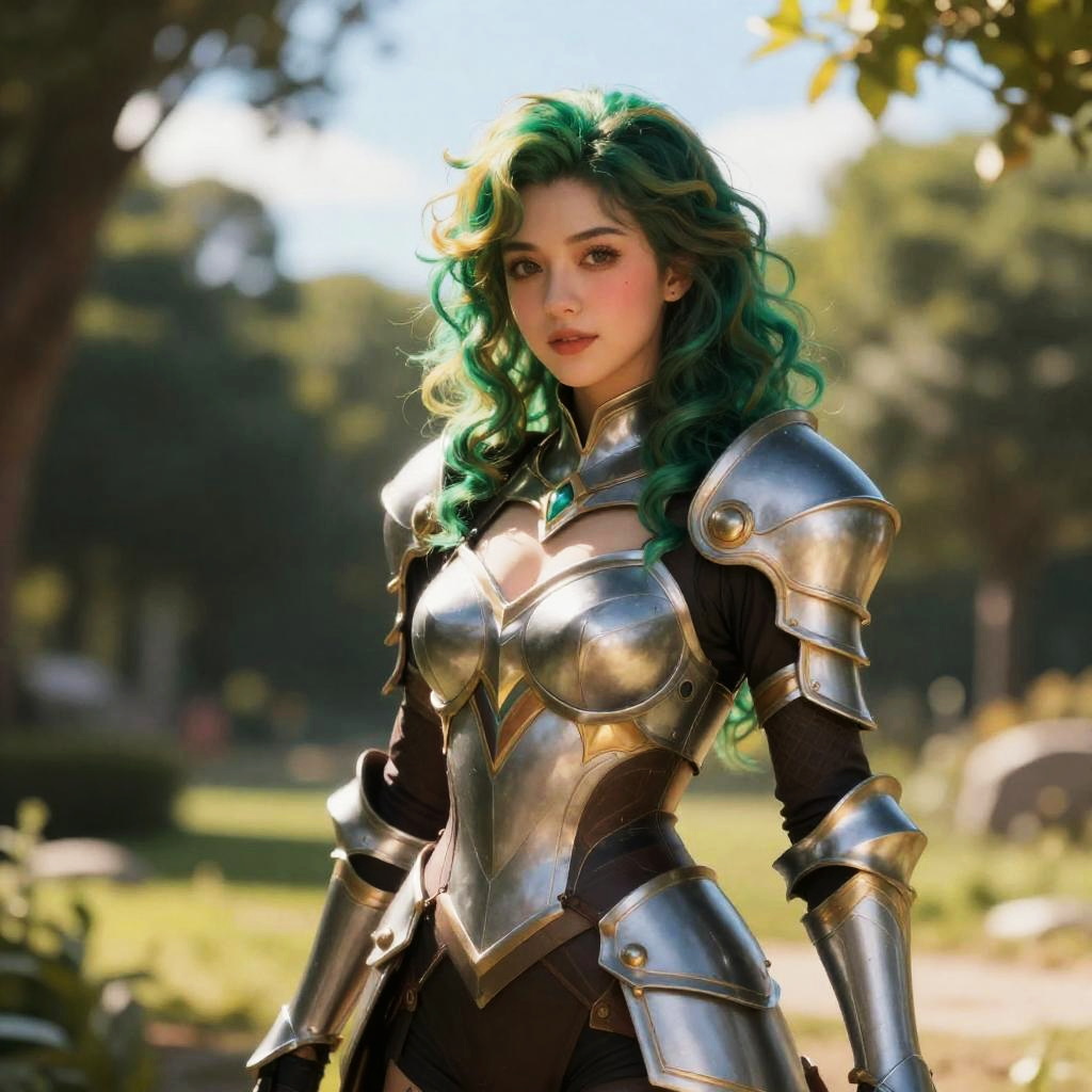 A young woman with emerald green and teal highlighted hair wearing intricate fantasy-style armor. The armor features metallic silver and gold shoulder plates, a sleek silver chest plate, and dark undergarments. She poses confidently outdoors in a park setting with soft natural sunlight filtering through trees, highlighting her detailed facial features and slight blush. The background is blurred with green foliage and a bright blue sky.