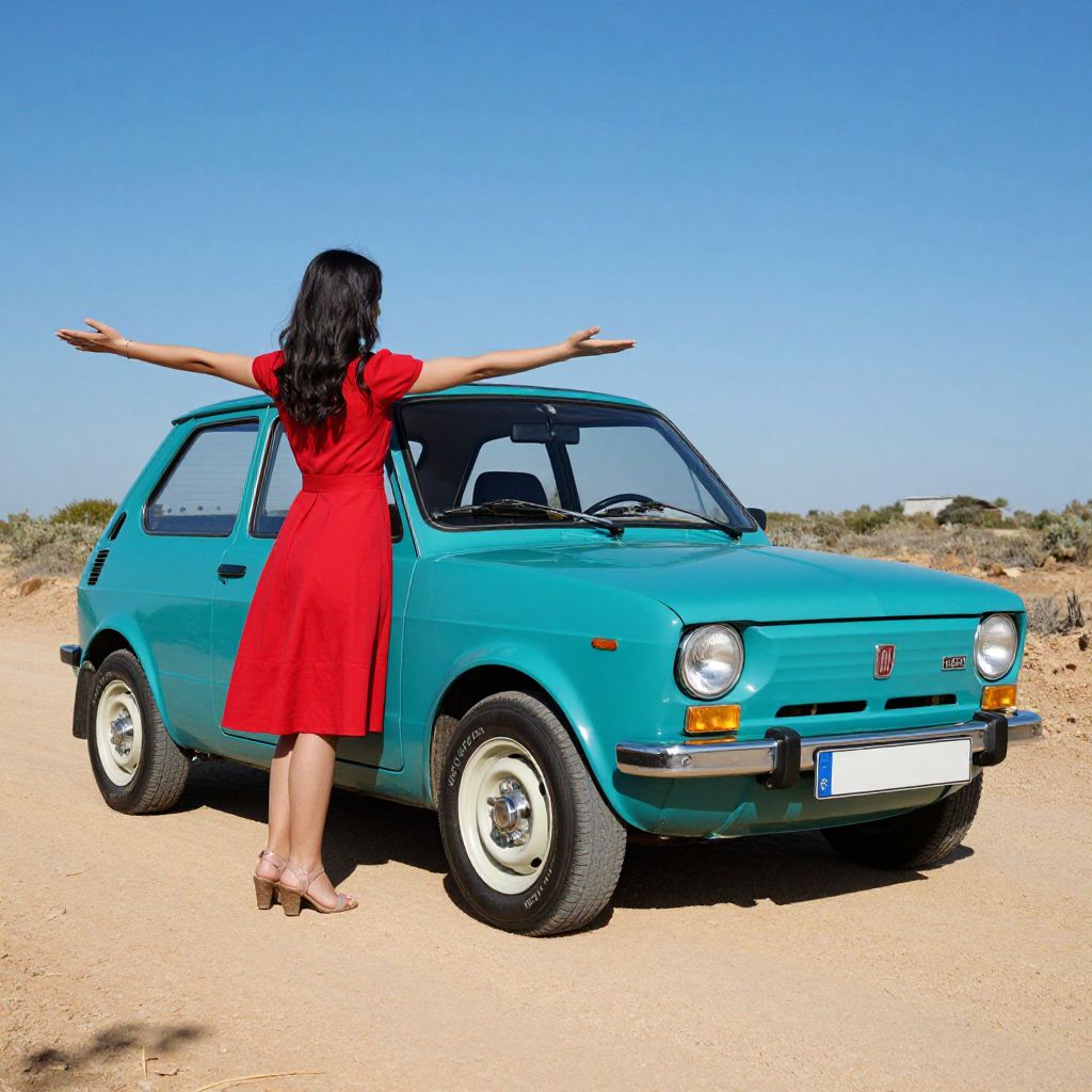 Classic turquoise Fiat 126P parked on a sunlit dirt road, with a woman in a vibrant red dress standing beside it, her arms outstretched as she gazes toward the horizon under a clear blue sky.