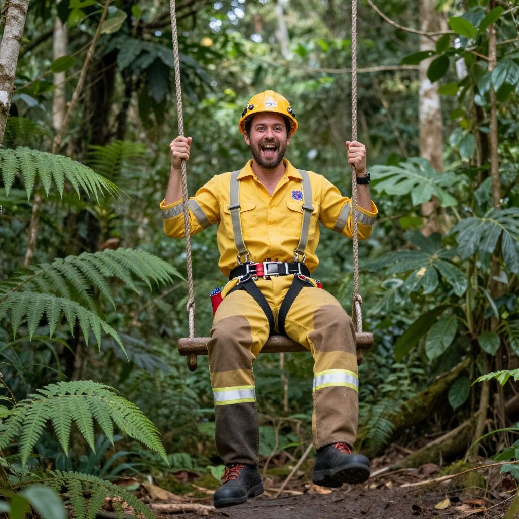 Photograph of a bearded man with a joyful expression, sitting on a wooden swing in a dense, green jungle. He wears a yellow firefighter helmet, matching yellow long-sleeve shirt with reflective stripes, brown pants, and black boots. His hands grip the swing's ropes, and his belt has various firefighting tools. The background is filled with lush ferns and tall trees, creating a vibrant, natural setting. The image is brightly lit, highlighting the man's cheerful demeanor and the vivid greenery around him.
