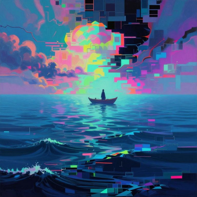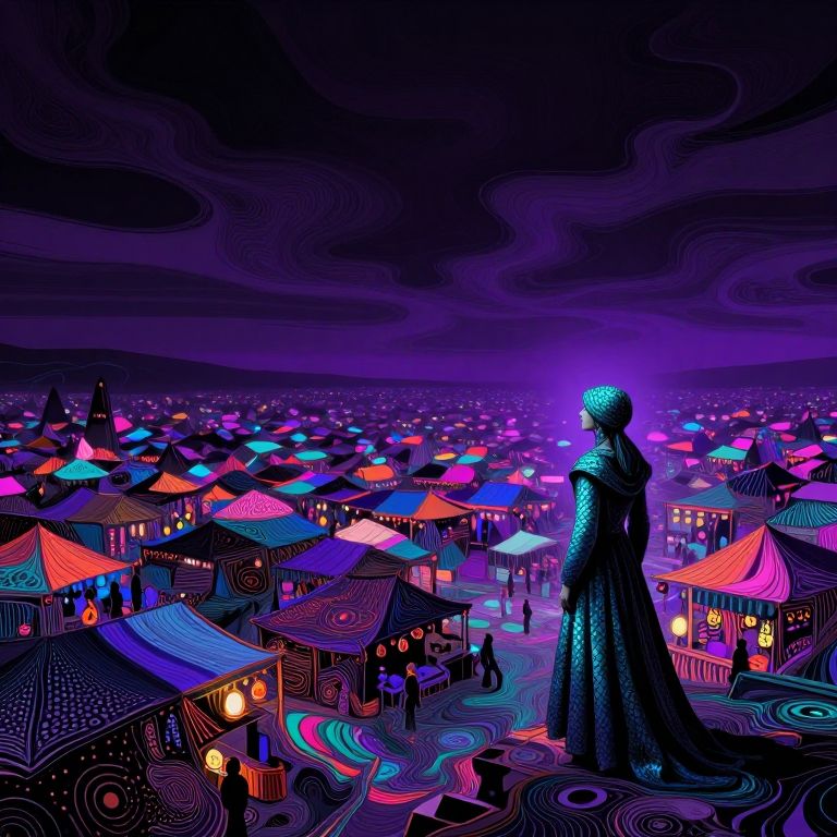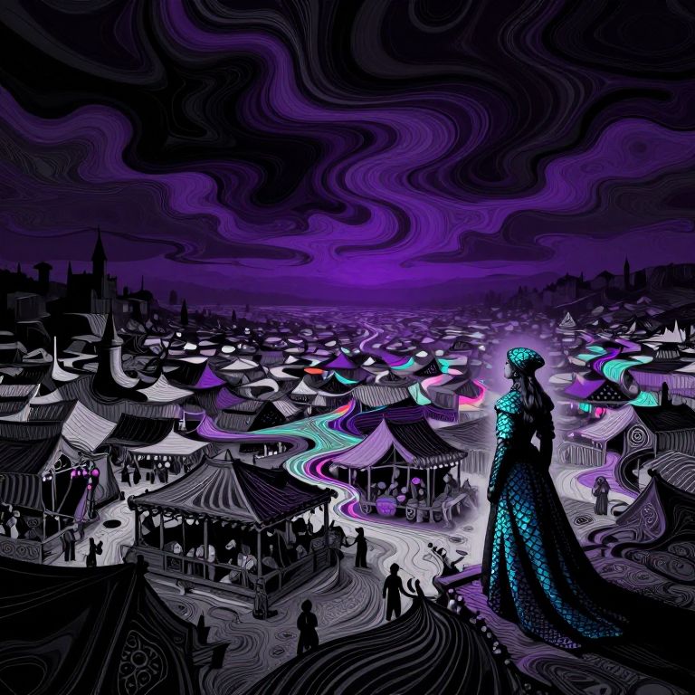 Ancientstyle, A surreal, abstract digital landscape stretches before us, where a glitched market looms under a vast, purple and black sky, The medieval merchant lady stands at the market's edge, her teal and blue scales shimmering in the eerie glow, The market, fragmented and distorted, pulses with intricate dot and line patterns, casting hypnotic wavy shapes across the scene, Above, the void stretches endlessly, swirling with vivid, otherworldly hues that blend fluidly with the dark sky, The patterns and colors twist unnaturally, with vibrant psychedelic tones stark against the high-contrast, minimalistic background, Amidst this chaotic yet captivating scenery, the merchant lady gazes into the void, her figure framed by the surreal, flowing motion of the glitching world around her, The strange mix of the distorted market, the alien sky, and the tranquil yet eerie scene creates a visual both majestic and unsettling, where the familiar warps into the unknown in a mesmerizing display, fluid motion high contrast