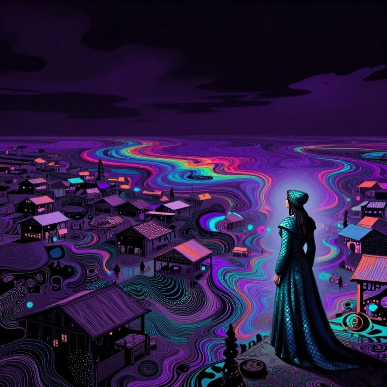 This digital artwork depicts a surreal night scene of a village with vibrant, neon-like waves of purple, pink, blue, and orange light flowing through it. In the foreground, a silhouetted figure in a long, flowing, textured dress stands on a rooftop, gazing over the luminous landscape. The village consists of small, dark houses with glowing windows, and a large, illuminated wheel is visible to the right. The sky is dark with scattered clouds, adding to the dreamlike atmosphere. The overall style is psychedelic and vibrant, with intricate, swirling patterns throughout the scene.