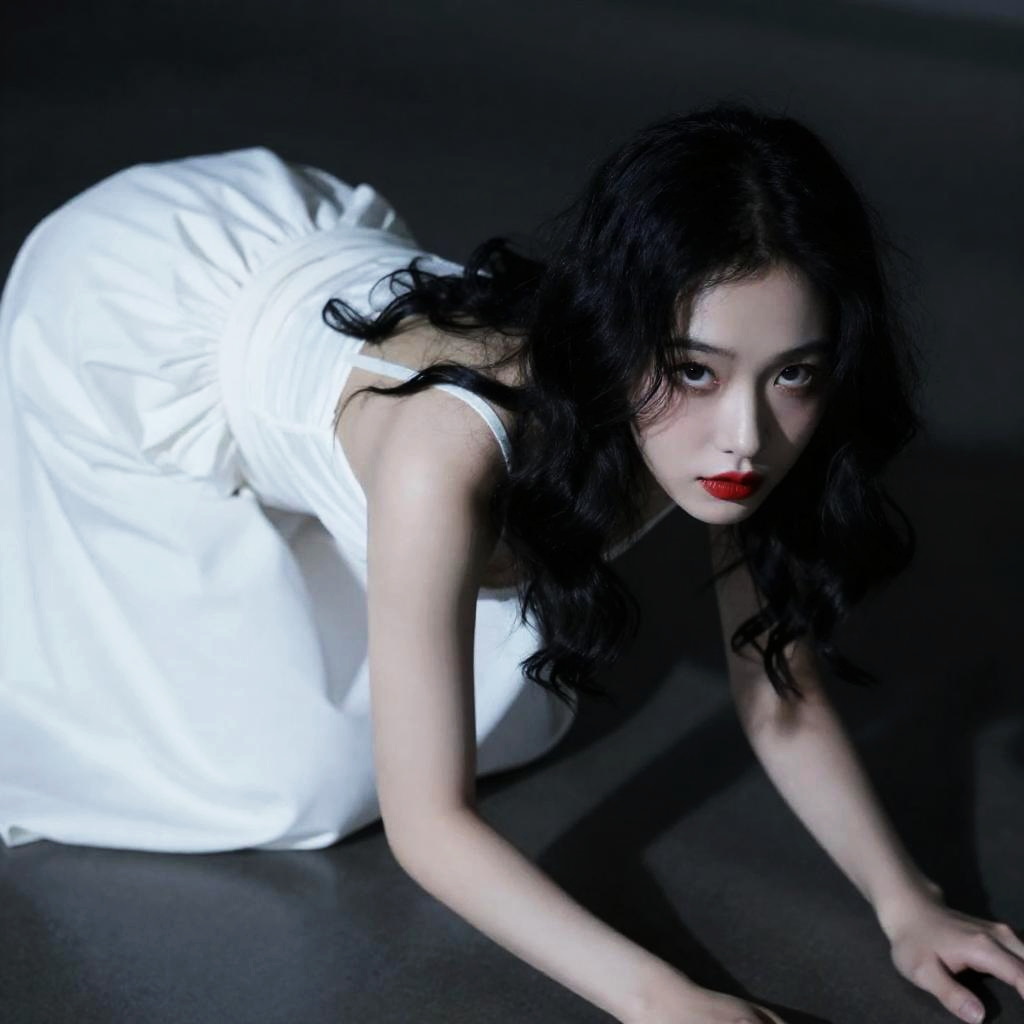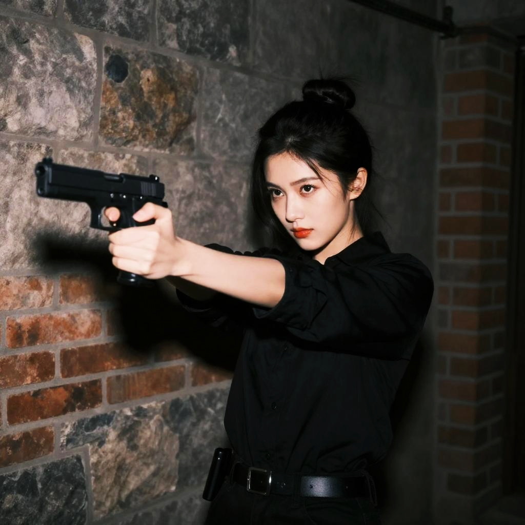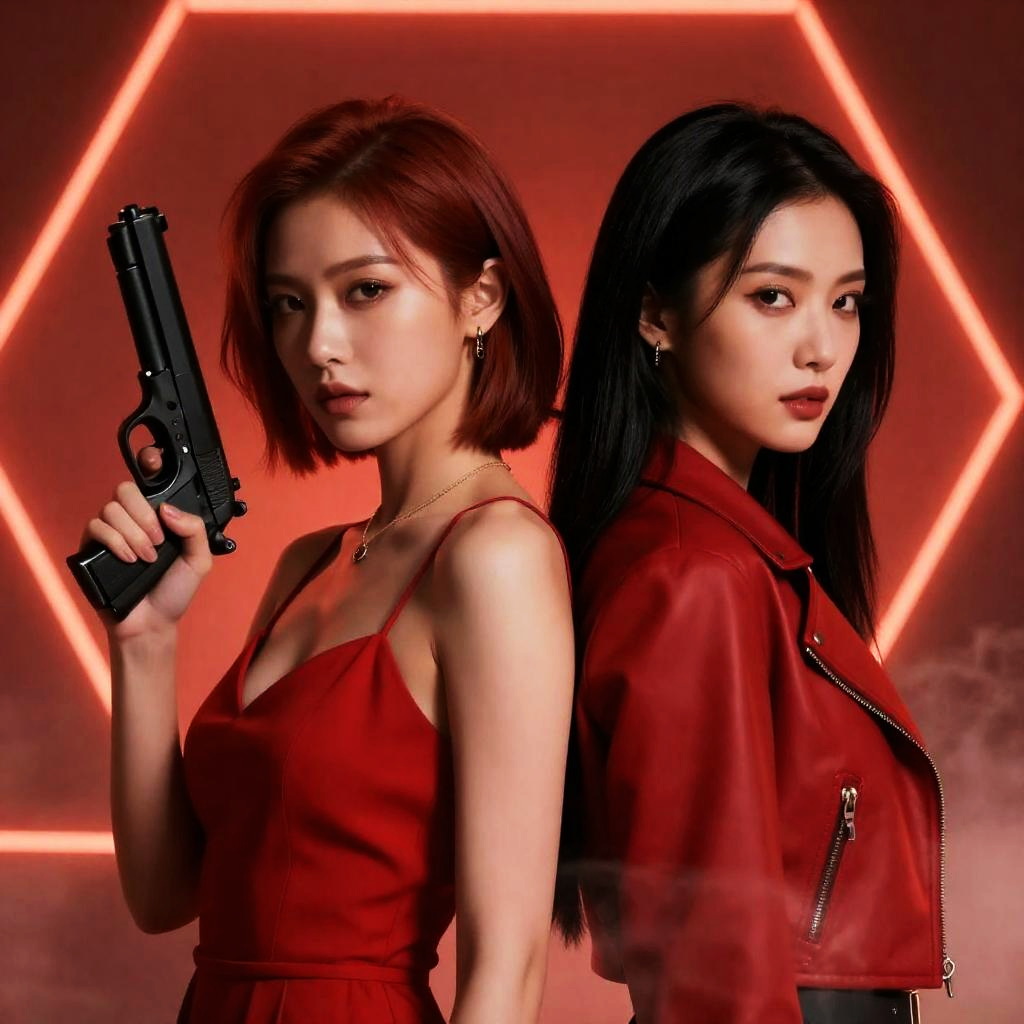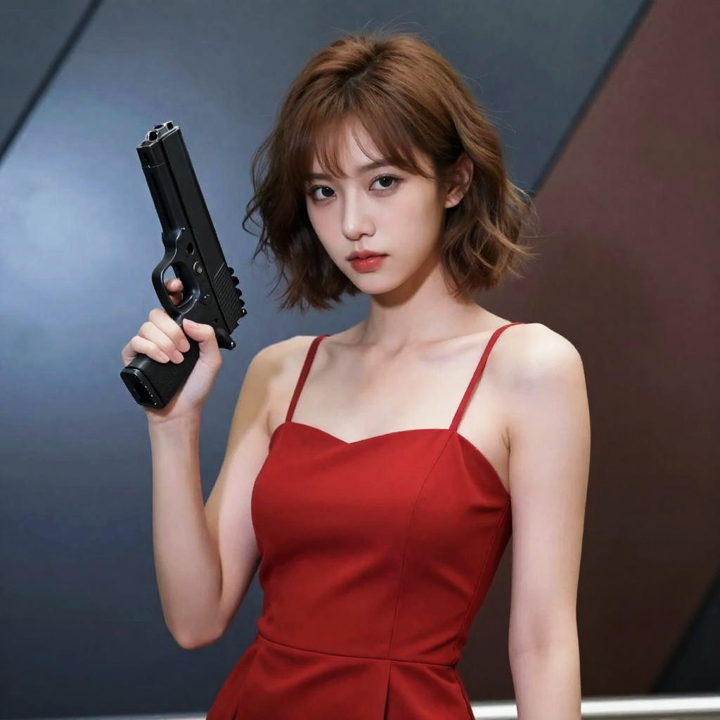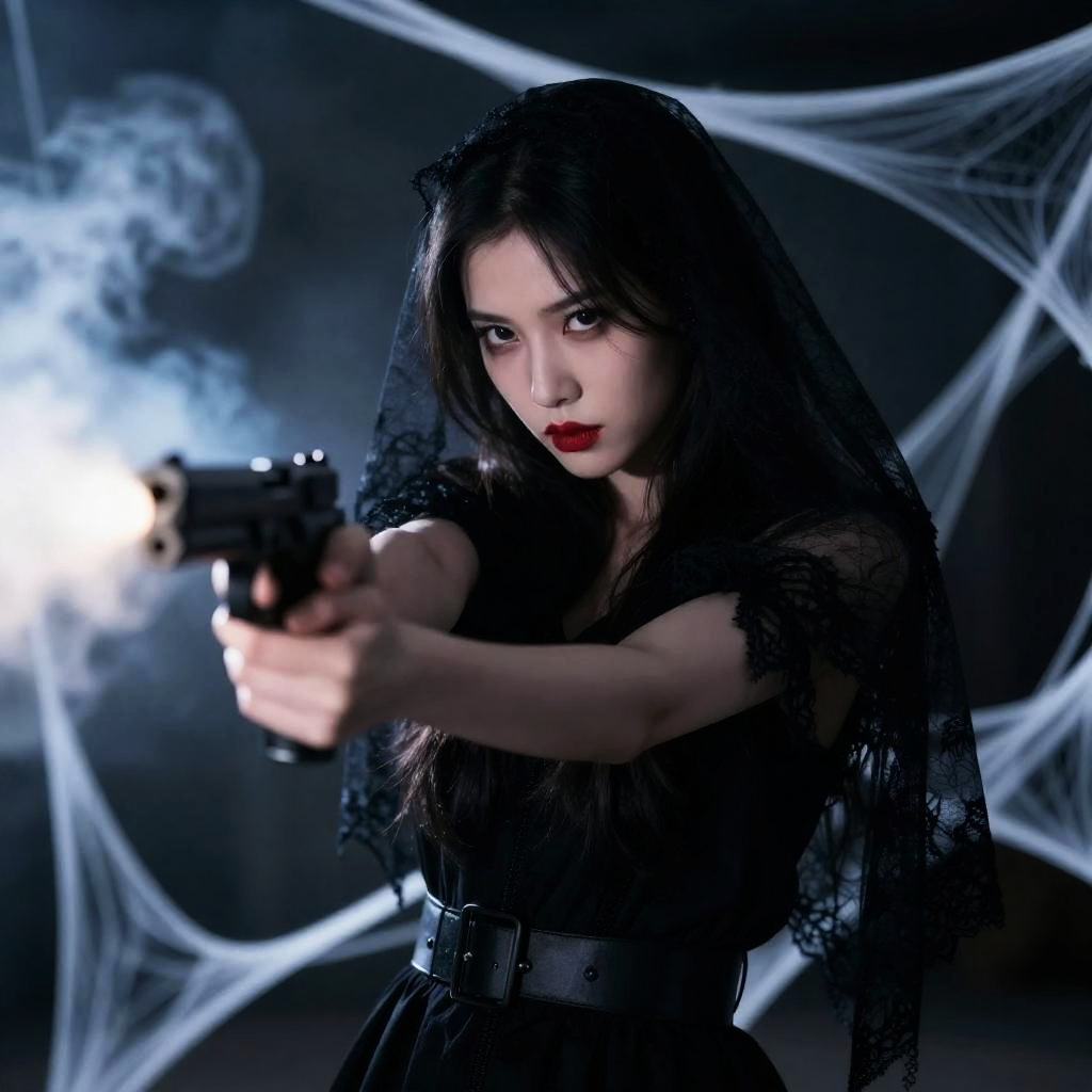 Woman in black veil, pale face with red lipstick, intense expression, aiming gun, firing, bright white smoke, spider web pattern background, dramatic lighting.