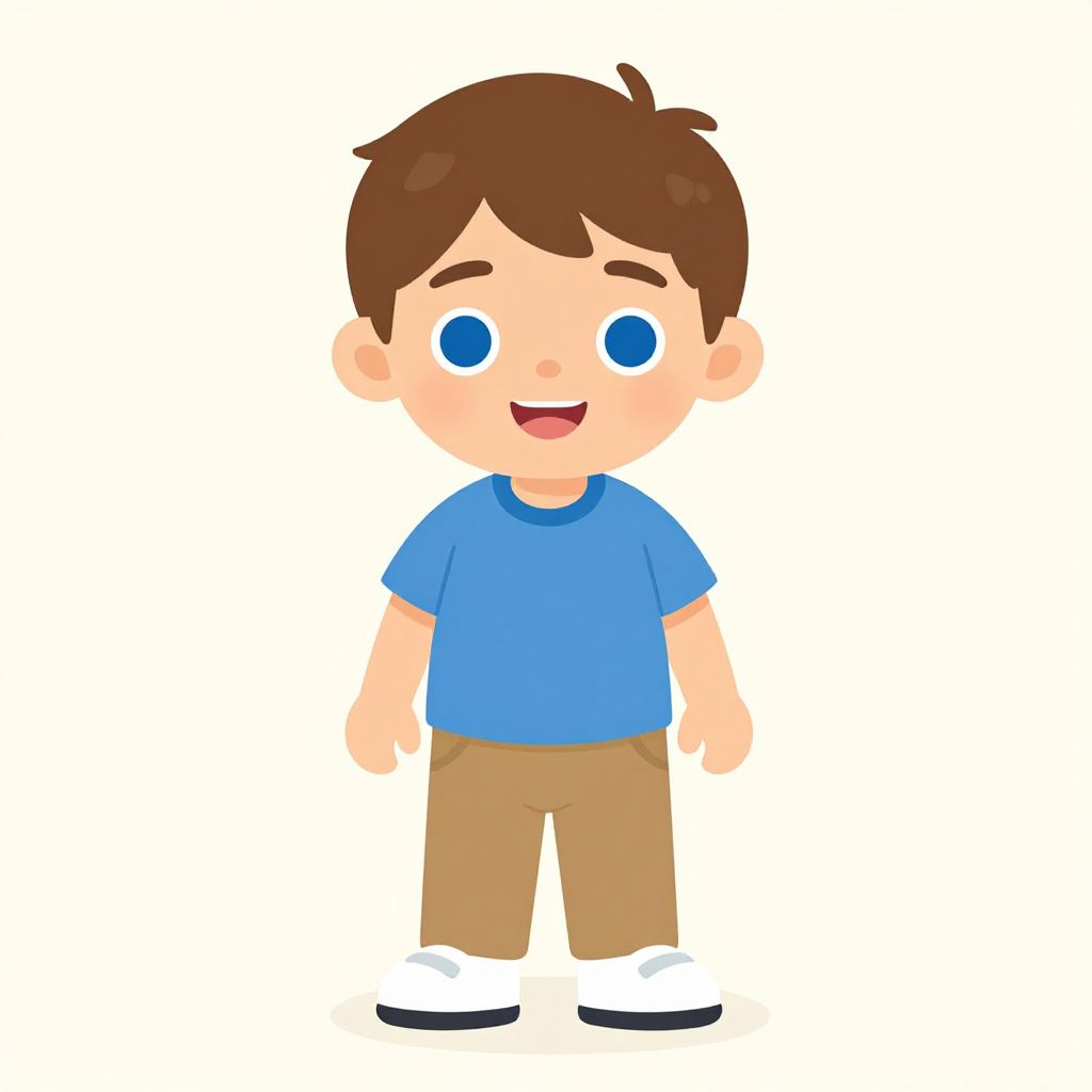 "Establishing Shot Childrens book illustration style, young boy character, 4 years old, simple, color, brown hair, blue eyes, blue t-shirt, brown pants, white shoes,"