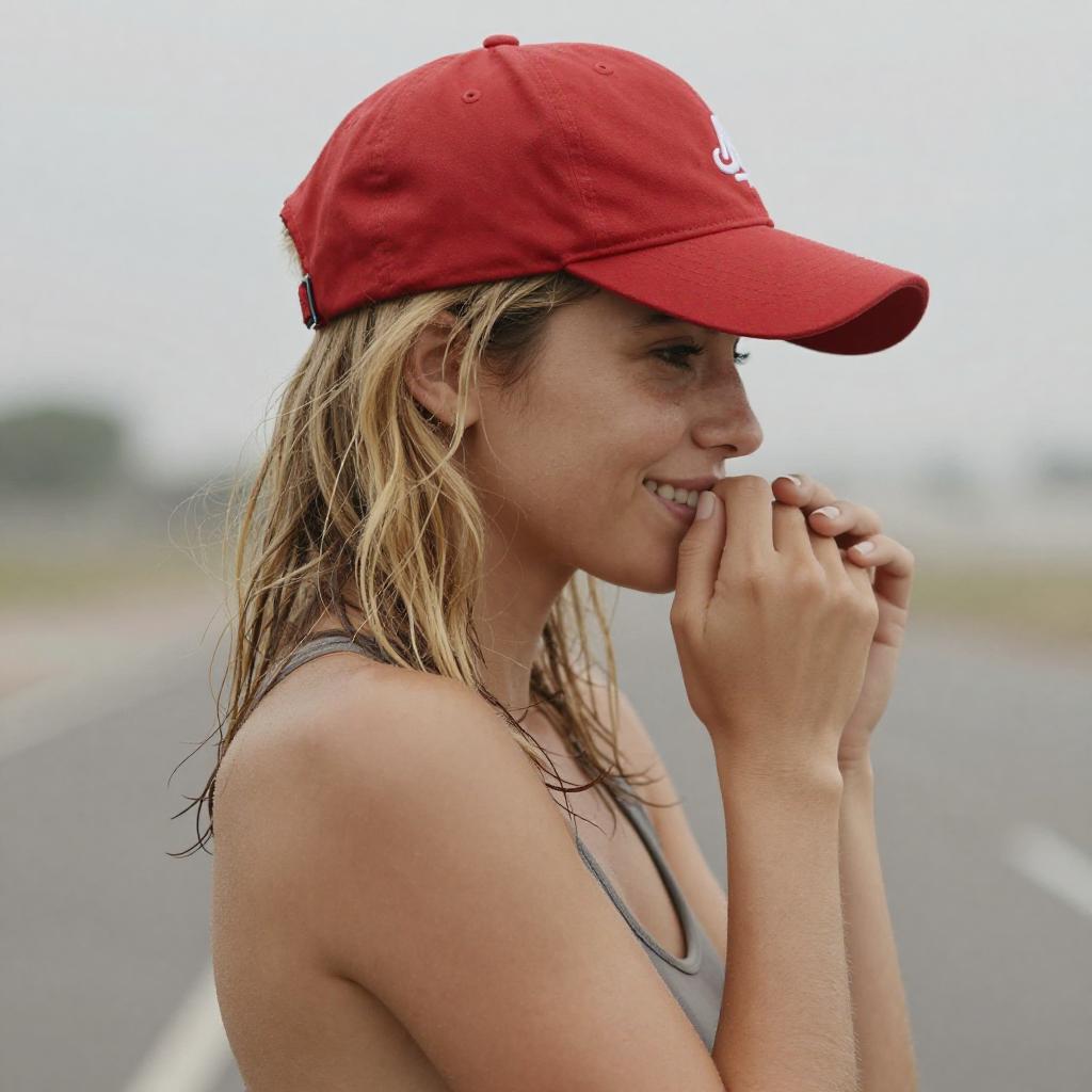 Photograph of a topless, slim woman with light skin and wet, blonde hair, wearing a red baseball cap. She's standing in profile, hands near her mouth, smiling slightly. The background is blurred, with soft, neutral lighting. The camera angle is slightly above eye level, and the depth of field keeps the woman in sharp focus while the background is out of focus.