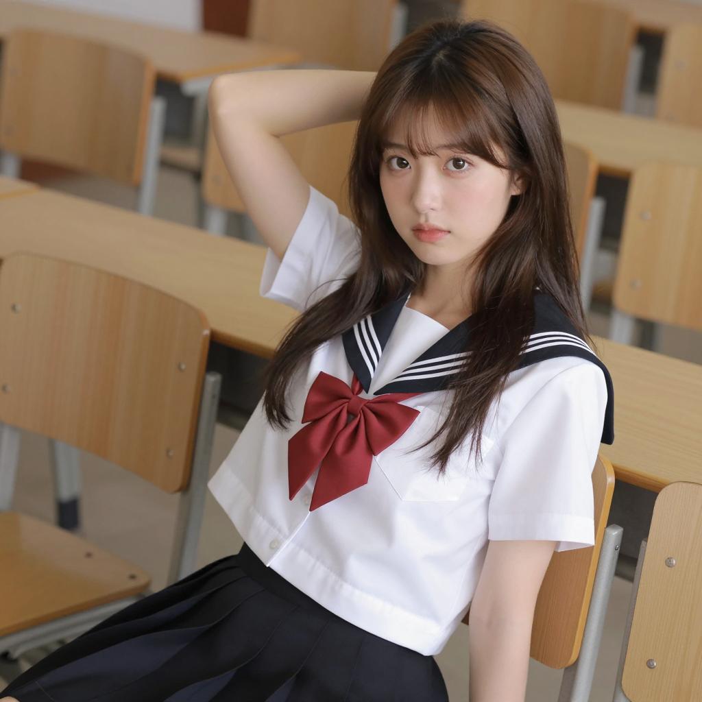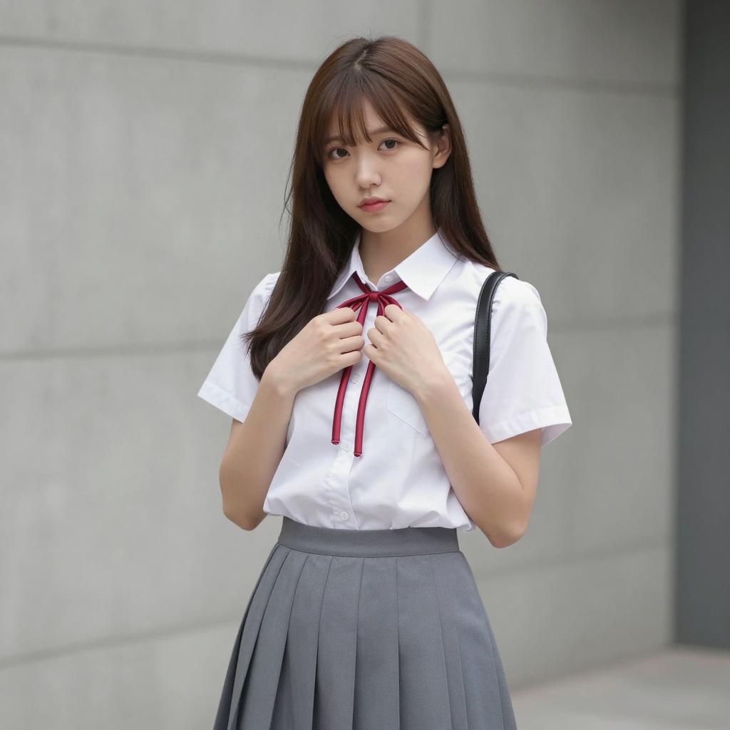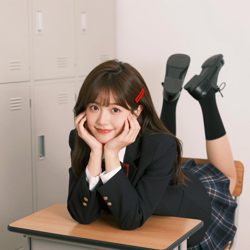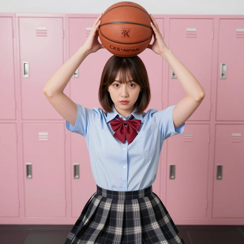 Asian woman with short brown hair, blue short-sleeve shirt, red bow tie, black plaid skirt, holding basketball above head. Standing in front of pink lockers, hands up, looking at camera. Background has lockers, black floor. CKS*JAPAN .