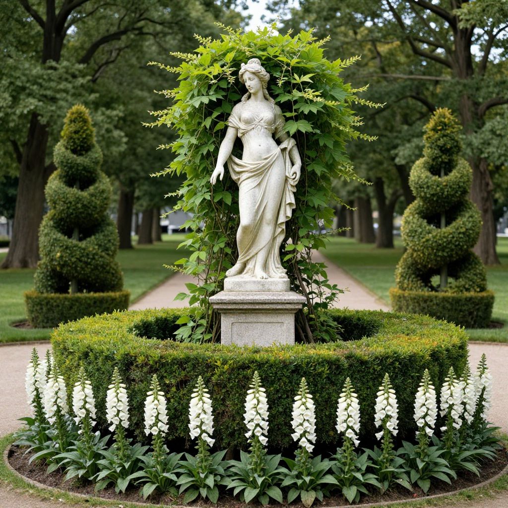 Lush green vines cascade around a Classical-style statue of a woman, elegantly positioned atop a pedestal within a meticulously trimmed circular hedge, surrounded by a vibrant bed of white foxglove flowers, while two intricately shaped spiral topiaries flank the scene in the background, leading toward a serene tree-lined pathway.