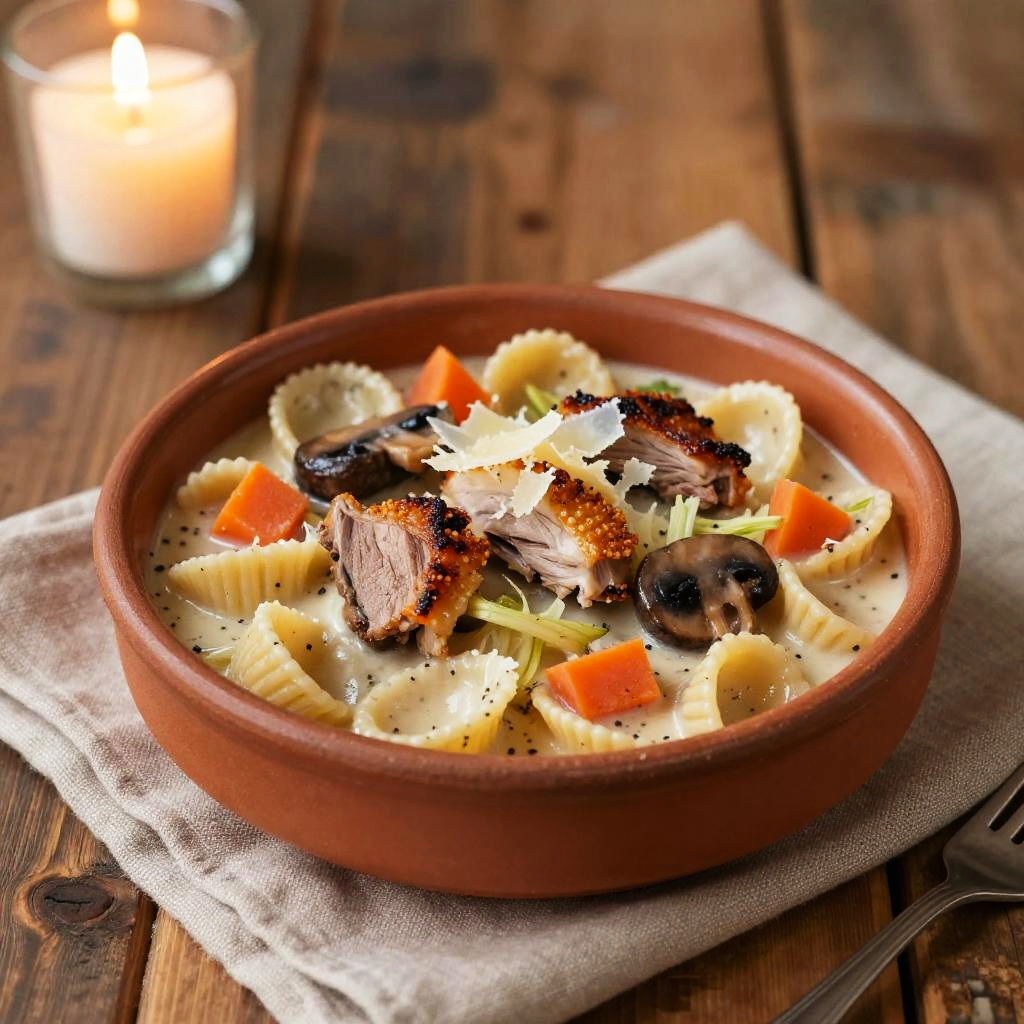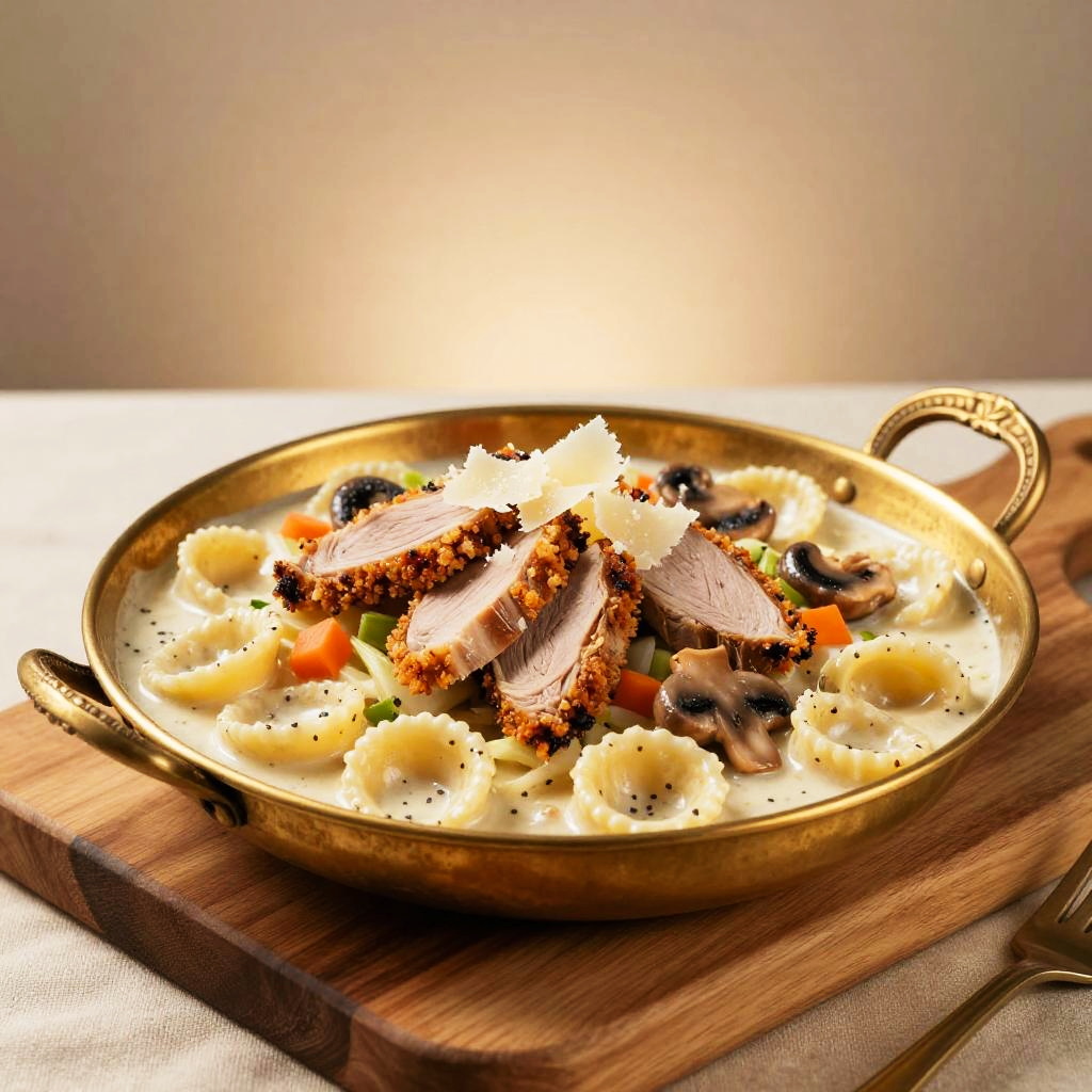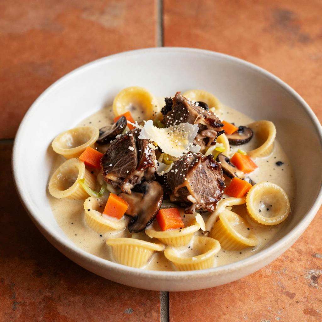 A bowl of orecchiette pasta in creamy ragu bianco with pieces of tender charred octopus tentacles and sautéed mushrooms, diced carrot and fennel, shaved parmesan, arranged on a matte navy ceramic plate on a weathered driftwood board, bathed in soft coastal twilight with cool blue fill and warm rim highlights, 8k professional food photography, shallow depth of field, hyper-realistic.