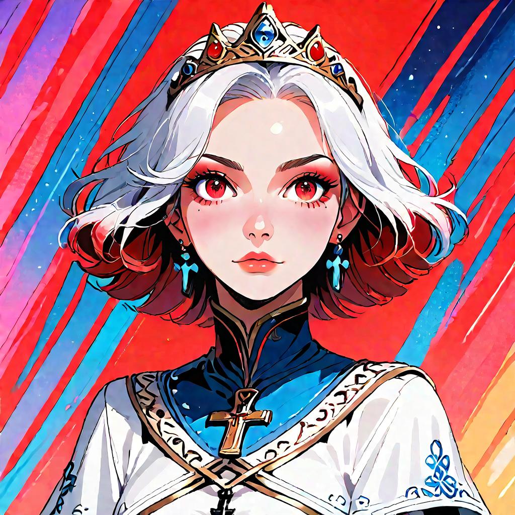 This is a vibrant digital illustration of a young woman with short, wavy red hair and striking red eyes. She wears a blue and white tiara adorned with sparkling blue gemstones, and a matching blue cross necklace. Her white, high-collared top features black lace trim. The background is a bright, abstract mix of white, blue, and pink, with circular patterns and floating petals. Her expression is confident and slightly serious, with rosy cheeks and full red lips. The art style is reminiscent of modern comic book illustrations, with bold lines and vivid colors.