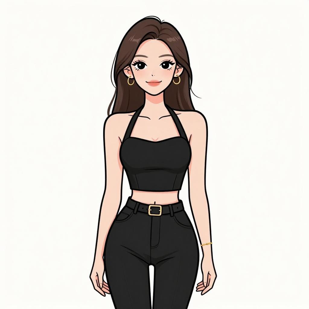 Woman with pretty face and pretty hair. smiling Woman, casual edgy, black knitted pullover, long sleeves, boat neckline, ribbed texture, black faux leather shorts, mid-thigh length, zipper details. --sref 1467