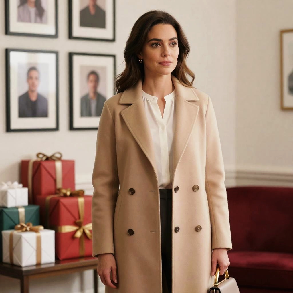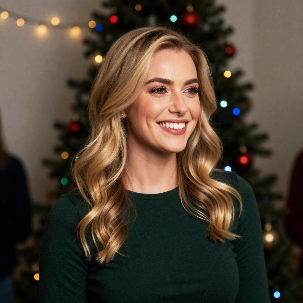 Portrait of a woman with long wavy blonde hair wearing a beige blazer over a maroon dress, standing indoors. She has a subtle smile and looks slightly to the right. The background features two blurred decorated Christmas trees with white lights and dark glass windows.