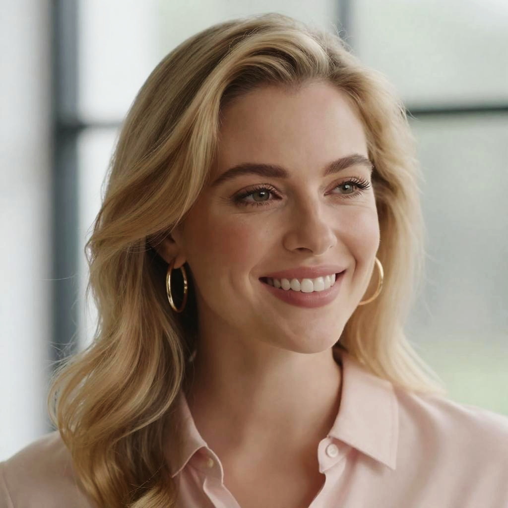 Photograph of a woman with long, wavy blonde hair, wearing a beige blazer and maroon dress, standing indoors. She has a subtle smile and looks slightly to the right. Background features two blurred Christmas trees with white lights. Dark glass windows are visible behind her.