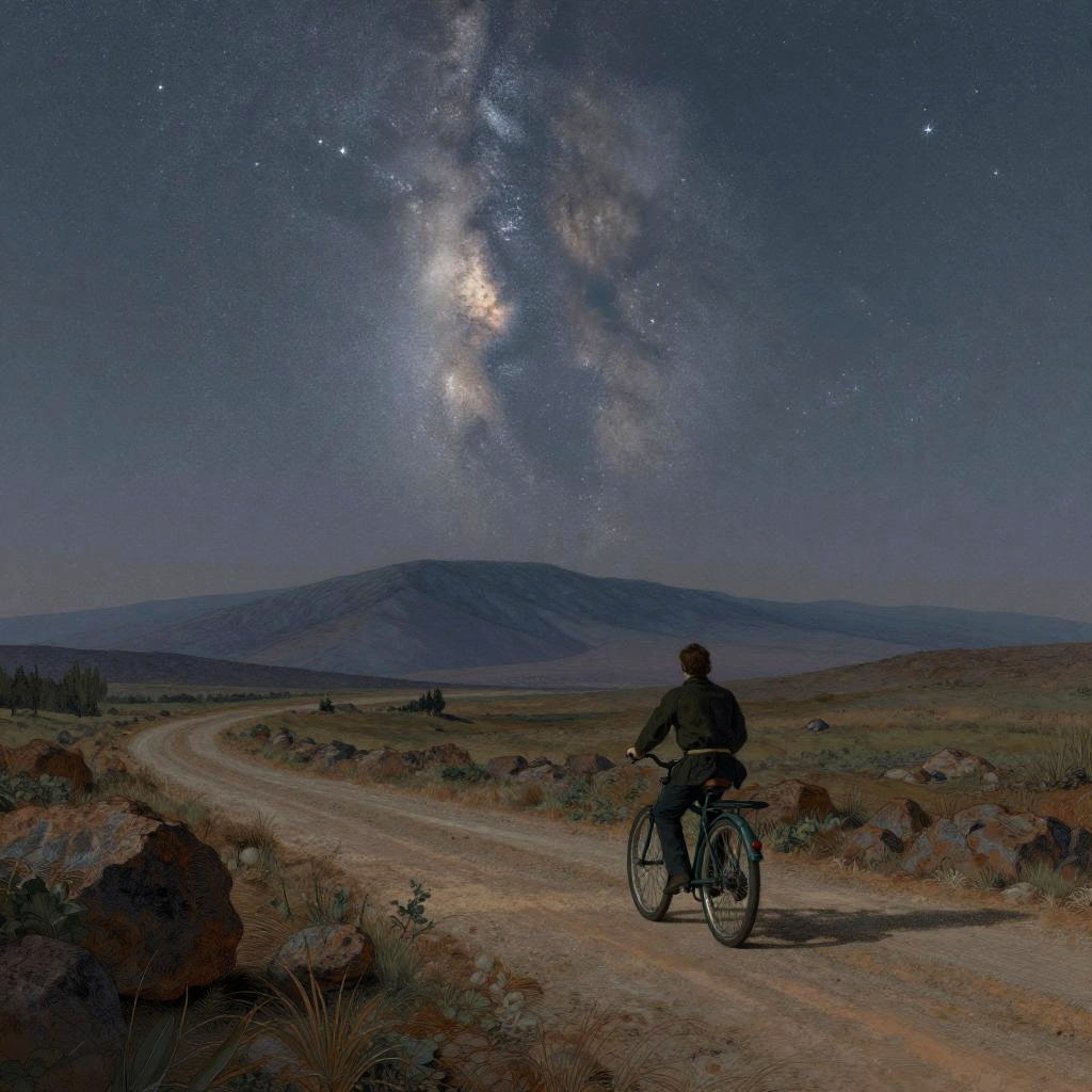 A starry night ride through a country road medium shot, rocky, at dusk, distant mountains, 4k, rule of thirds, extreme detail, hazy, intricate ink illustration, surreal, surrealist, trending on artstation, cgsociety, hd, calm, complimentary colours, realistic lighting, by Albert Bierstadt