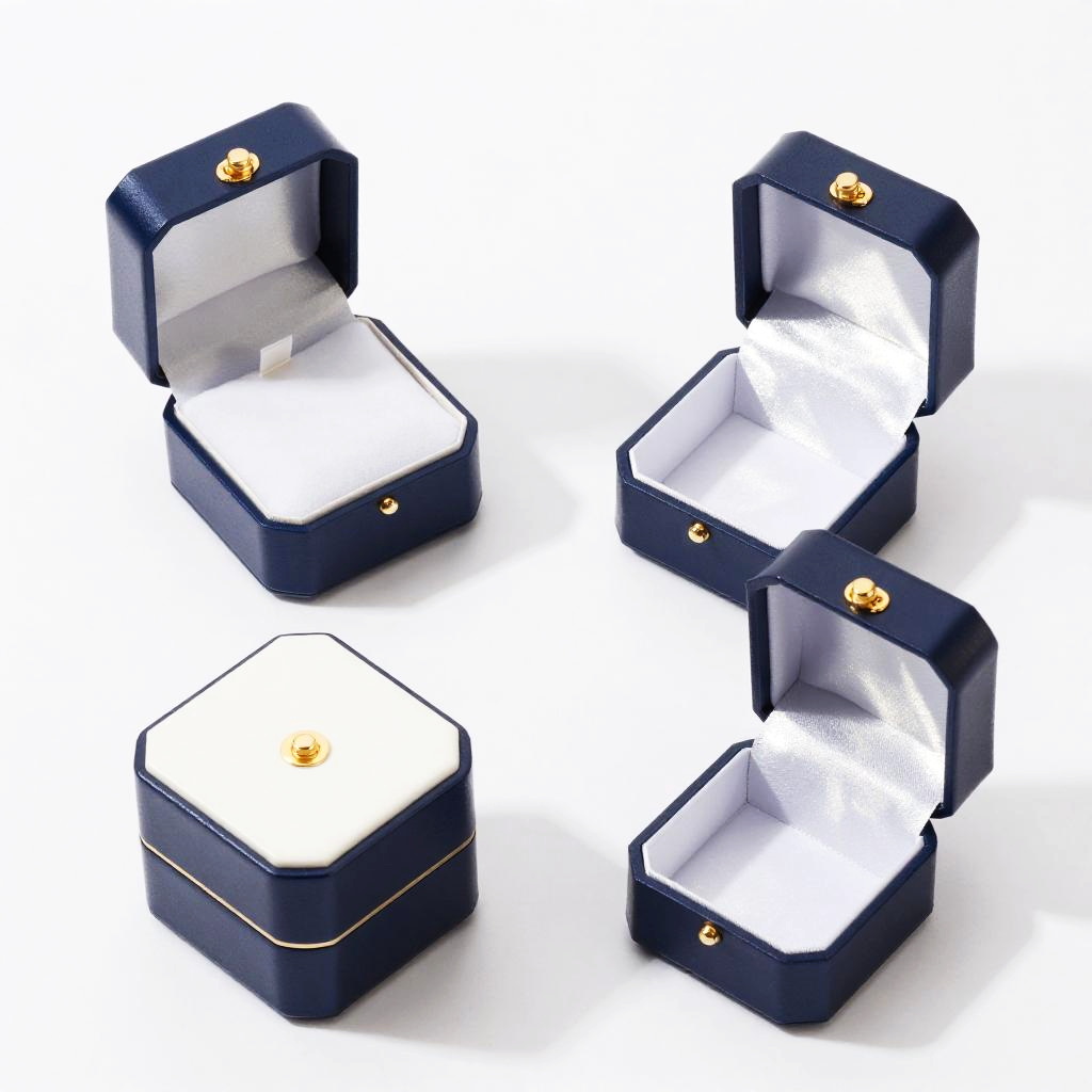 Photograph of four dark blue leather ring boxes with gold clasps, positioned on a white background. Each box is open, revealing a pristine white interior. The boxes are arranged in a diamond-like pattern, with two boxes in the top row and two in the bottom row. The leather exterior is smooth and polished, contrasting with the soft, velvety texture of the white interiors. A small gold ring is visible inside the top left box, adding a subtle accent. The image is brightly lit, emphasizing the clean, elegant design of the ring boxes.