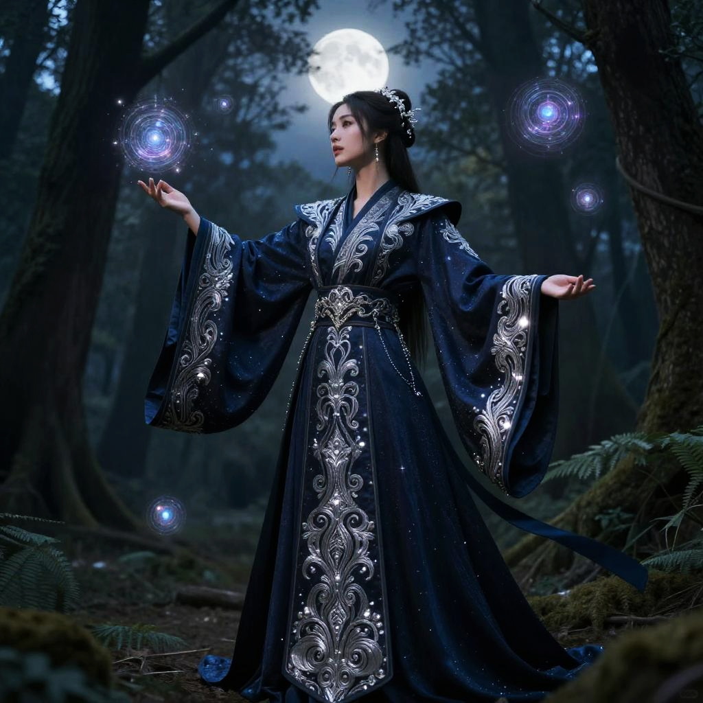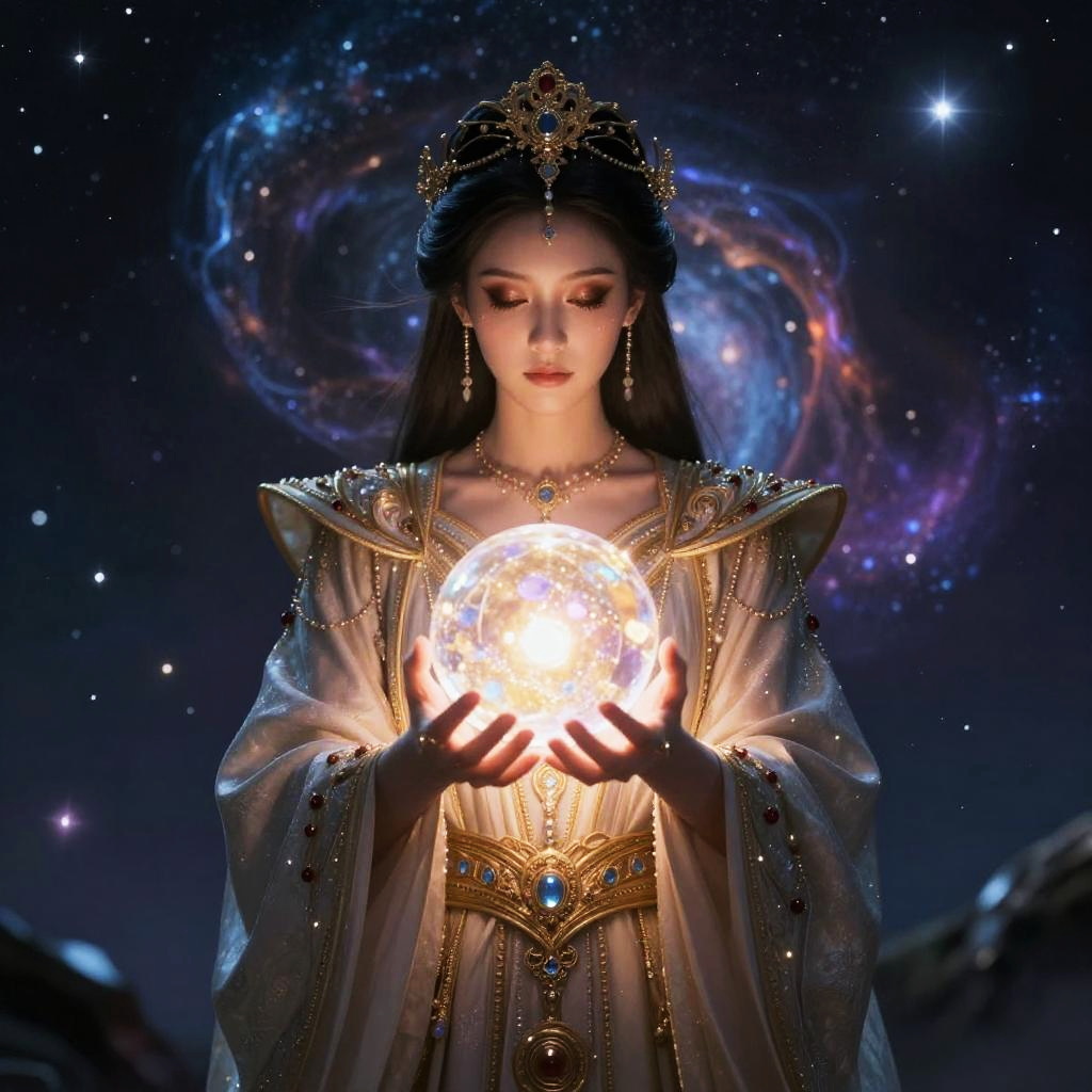 A mystical figure stands in the foreground, exuding a sense of powerful energy with a radiant orb held in their hands. The intricate detailing of their ornate robes and the celestial background create a captivating blend of fantasy and magic, highlighting a world rich in imagination and wonder.