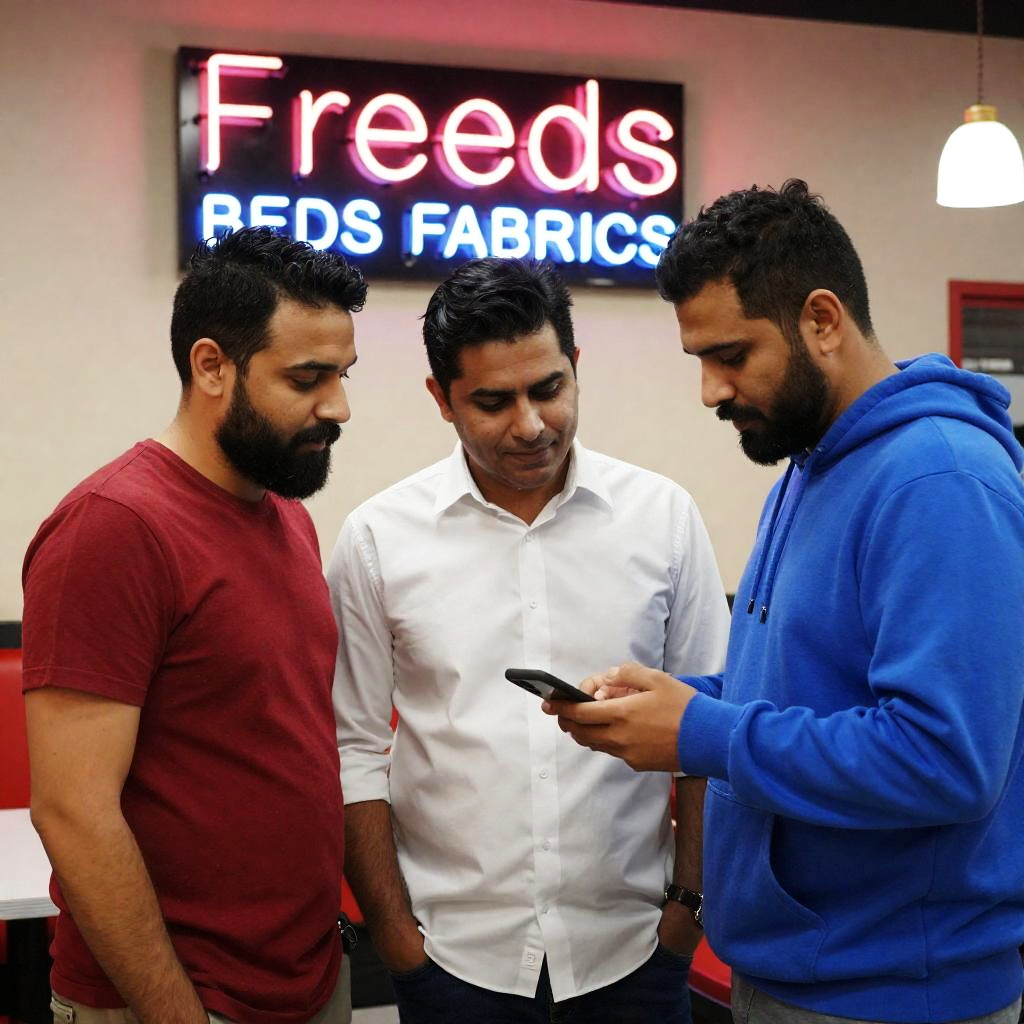 Three men standing in a diner, neon "Fred's Beds Fabrics" sign in background. Left man in red shirt with beard, middle man in white shirt, right man in blue hoodie, looking at phone. Casual, engaged conversation, warm lighting.