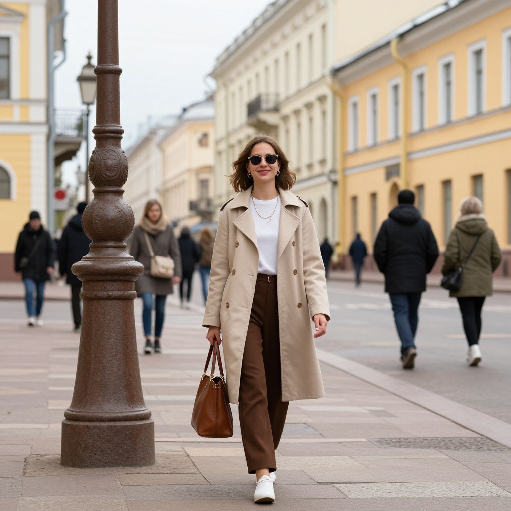 Fashionably dressed woman strolling down a vibrant city avenue in St. Petersburg, carrying a brown handbag and smiling brightly as she walks past a lamppost, other pedestrians, and colorful storefronts.
