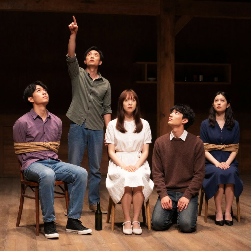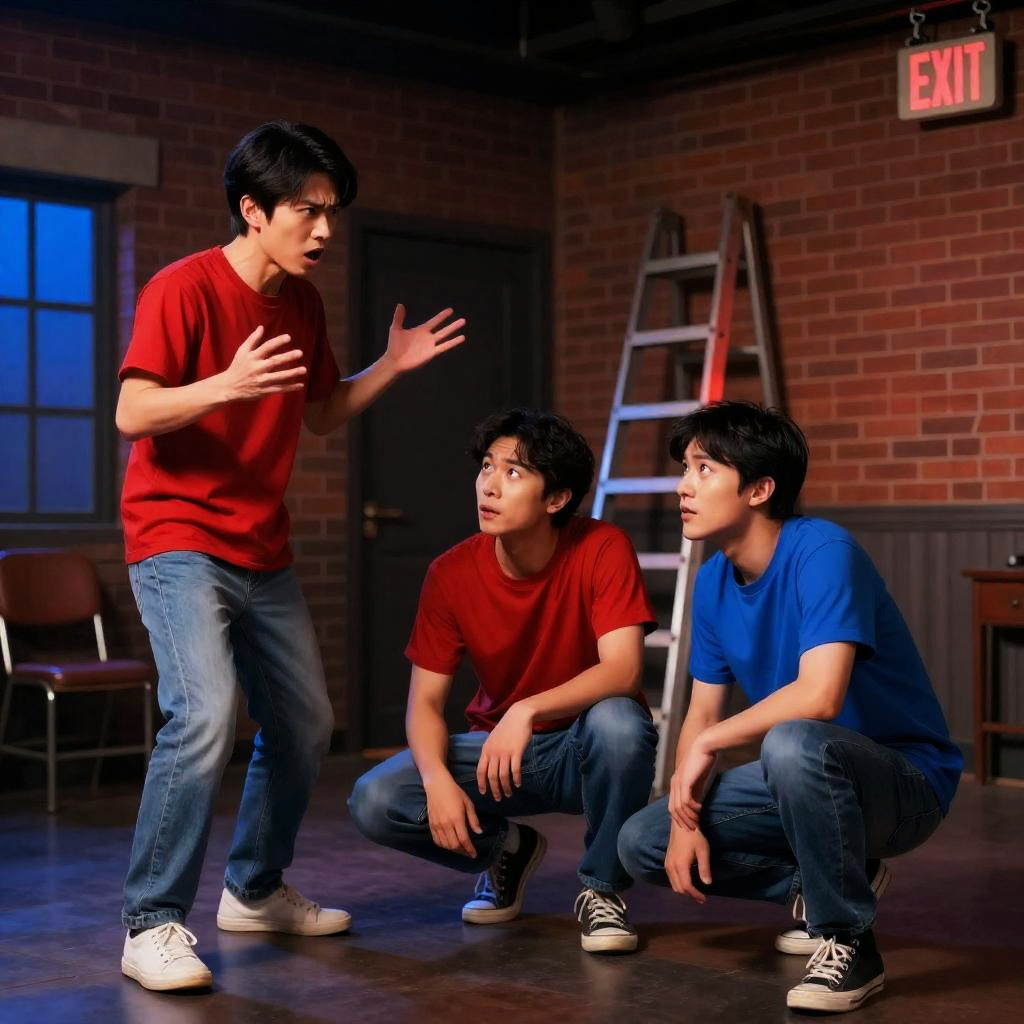 Three animated men in a dimly lit brick room. One stands gesturing with an angry expression, two crouched men with intense expressions wear red and blue shirts, jeans. Ladder, chair, and EXIT sign in background. Blue and red lighting.