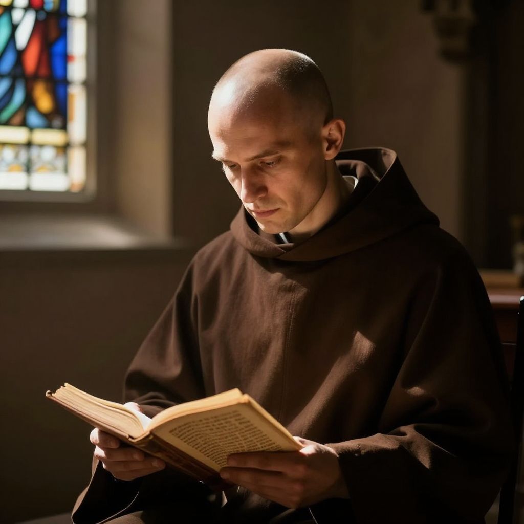 Franciscan monk haircut, bald crown and short hair surrounding it, serene monk reading ancient scripture, sunlight filtering through stained glass, rustic interior, calm atmosphere