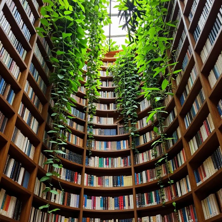 Photograph of a grand, circular library with towering, dark wooden bookshelves filled with colorful books arranged vertically. Bright green leafy vines cascade from the ceiling, creating a natural canopy over the central area. The sunlight filters through the leaves, illuminating the upper part of the room. The shelves are evenly spaced, and the books vary in size and color, adding a vibrant contrast to the dark wood. The overall atmosphere is serene and scholarly, blending natural and literary elements.