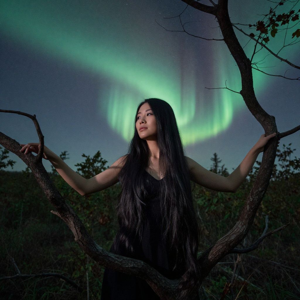 Photograph of an Asian woman with long black hair standing amidst tree branches, gazing at vibrant green Northern Lights in a dark, forested night sky