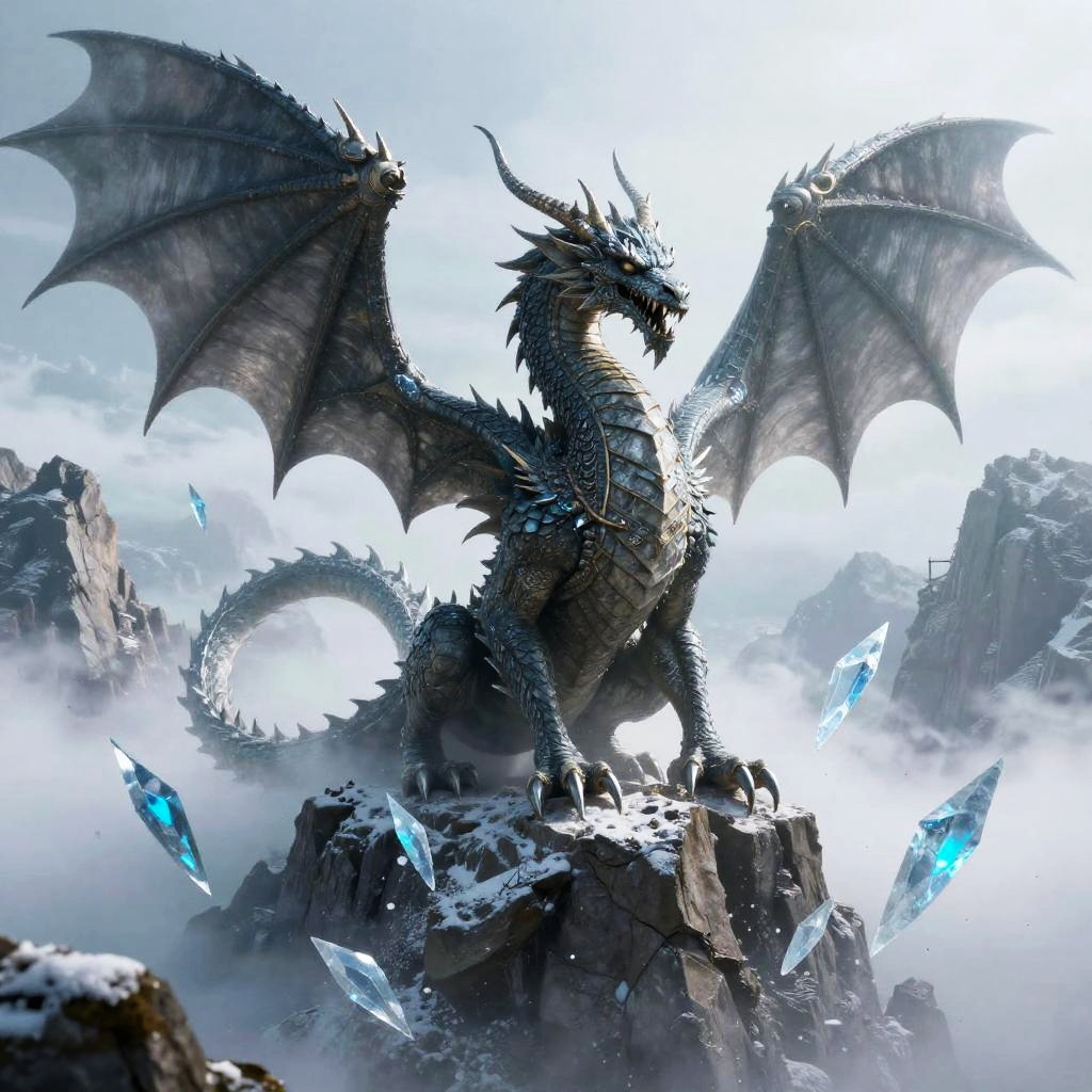 An epic fantasy scene of an ancient stone dragon, wielding sharp obsidian claws, standing in a mist-covered mountain peak, surrounded by floating shards of ice and swirling snow, with cold azure light shimmering through the fog, highly detailed, cinematic composition