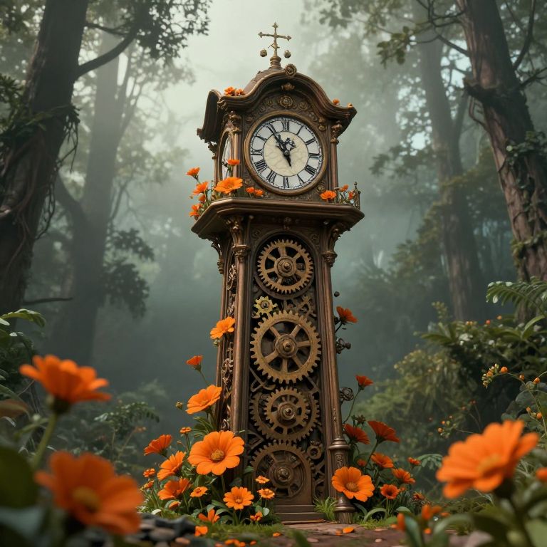 A surreal digital artwork depicts an ancient clocktower adorned with vibrant orange flowers and intricate mechanical gears, set against a misty forest backdrop, evoking a fantastical blend of steampunk and natural beauty.