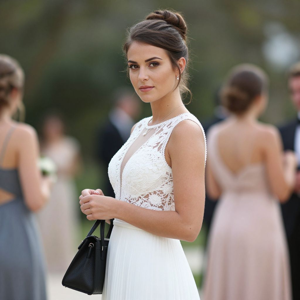 Woman wedding guest outfit, 1girl, solo, brown hair, blurry background, blurry, looking at viewer, brown eyes, outdoors, bag, hair bun