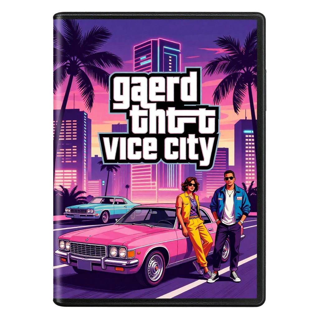 GTA Vice City box art style featuring neon-lit Miami-inspired cityscape at dusk, vibrant pink and purple hues, dynamic 1980s retro aesthetic with stylish characters in vintage cars, palm trees swaying, vivid graphic novel illustration.