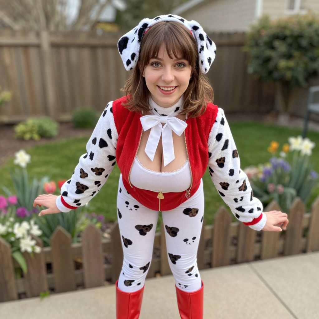 A cheerful and lively young woman in her late 20s with soft brown hair and kind, smiling eyes is wearing a delightful dalmatian costume, complete with a red and white spotted jacket, a white bow tie, and a pair of red boots, standing in a sunny backyard during springtime, with blooming flowers and a small garden fence in the background.. The woman has big tits and cute face