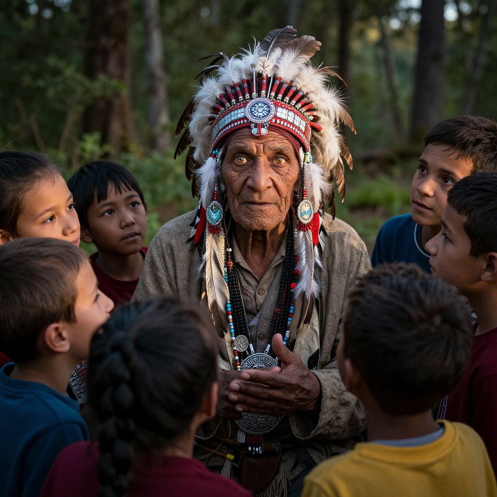 Envision a striking, hyperrealistic portrait of an elder, wise and kind, sharing an ancient tale with a group of wide-eyed children gathered at their feet. The warm, diffused light of the setting sun illuminates the scene, casting long shadows that accentuate the deep wrinkles on the elder's weathered face. Their eyes, full of wisdom and empathy, reflect the diverse group of children surrounding them. The elder wears an intricate headdress adorned with feathers, beads, and symbolic trinkets, commanding attention while exuding an air of dignity and knowledge. The lush forest backdrop blends seamlessly with the elder's skin tones, creating a vibrant, natural palette that emphasizes the deep connection between humanity and nature. This captivating image captures the essence of shared knowledge, the enduring bond between generations, and evokes a sense of wonder and emotion through its intricate details and harmonious color story.