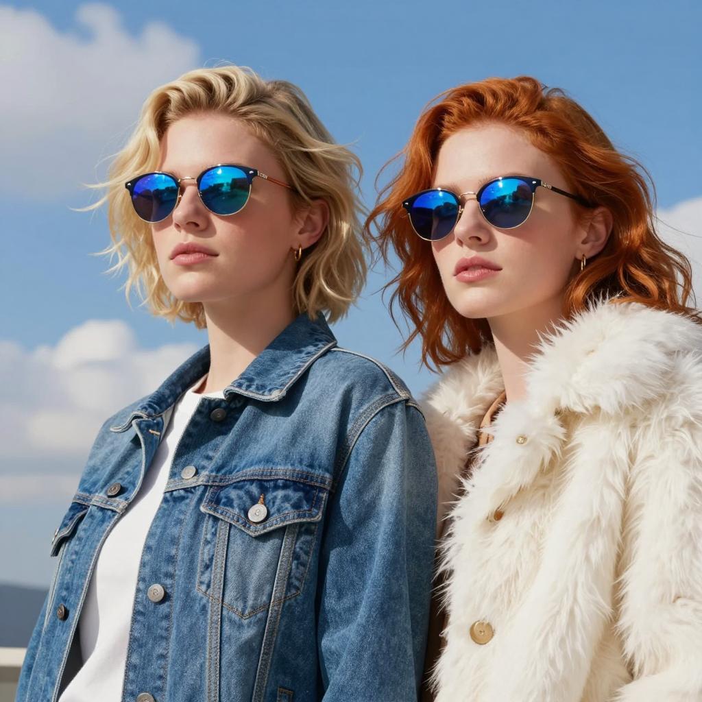 Two women with red hair, wearing sunglasses and casual clothes, standing outdoors against a graffiti-covered wall. One wears red sunglasses, the other wears a red top with a cat print. Sunlight casts shadows. The woman on the left smiles, the woman on the right has a slightly open mouth. Urban alleyway in the background.