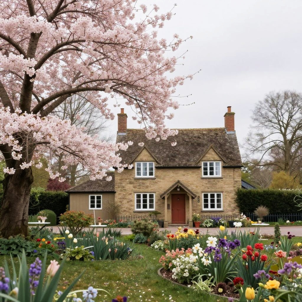 Landscape cherry blossom with a nearby cottage, blooming trees surrounding the house, colorful flowers in the garden, soft pastel colors, cozy and picturesque springtime view