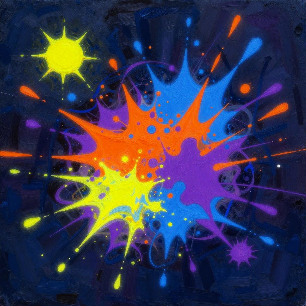 This is a digital abstract painting with a dark, textured background. Bright, neon-like colors in blue, orange, purple, and yellow burst across the canvas in chaotic, energetic patterns. The upper left has a small, yellow sun-like shape, while the lower center is filled with intense, overlapping splashes of color. The overall style is vibrant and dynamic, with a sense of movement and energy.