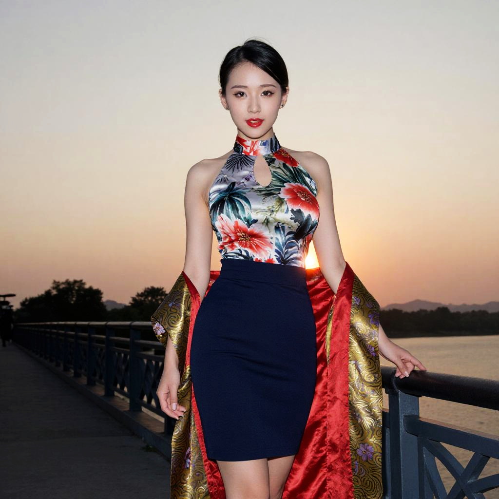 A Slim woman, dressed in a trendy high neck sleeveless top with a floral pattern and a fitted navy blue knee-length skirt, captured in the vibrant visual style of kodachrome analog film, enjoying a sunset photography moment on a bridge. Sexy. Pretty face and beаutiful eyes. Big breasts BREAK chinese, asian, traditional Chinese aesthetics, delicate brushwork, ink wash painting textures, vibrant red and gold accents, elegant Asian female, silk fabrics, ornate patterns, soft lighting, ethereal atmosphere