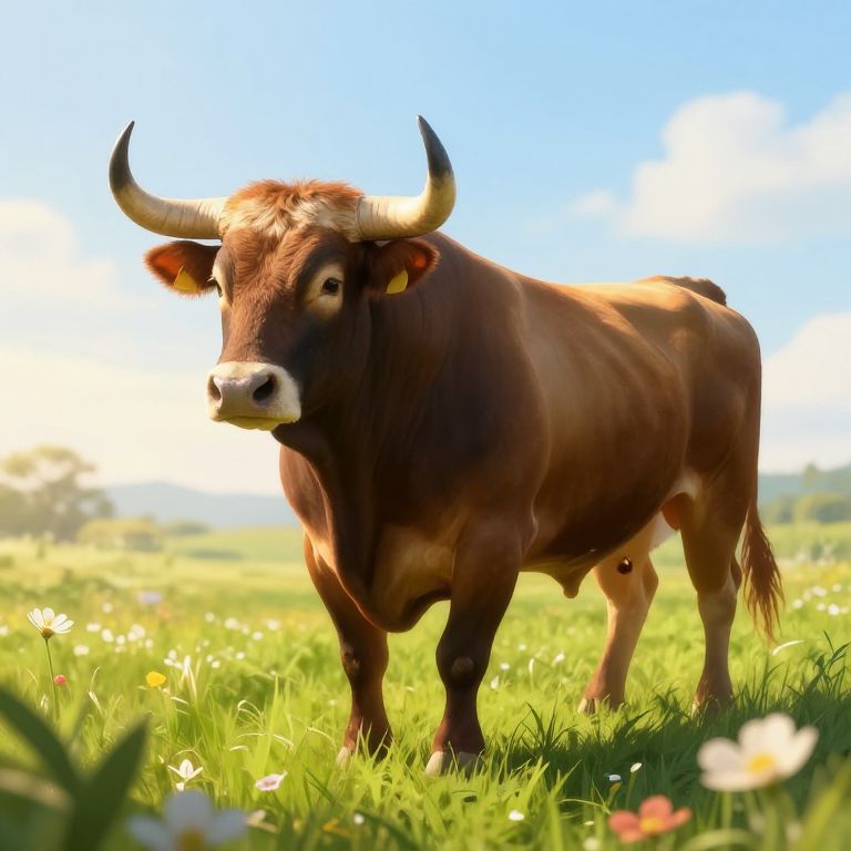Taurus spirit animal portrayed as a robust bull emerging from lush green fields with blooming flowers, surrounded by soft golden sunlight and a serene blue sky