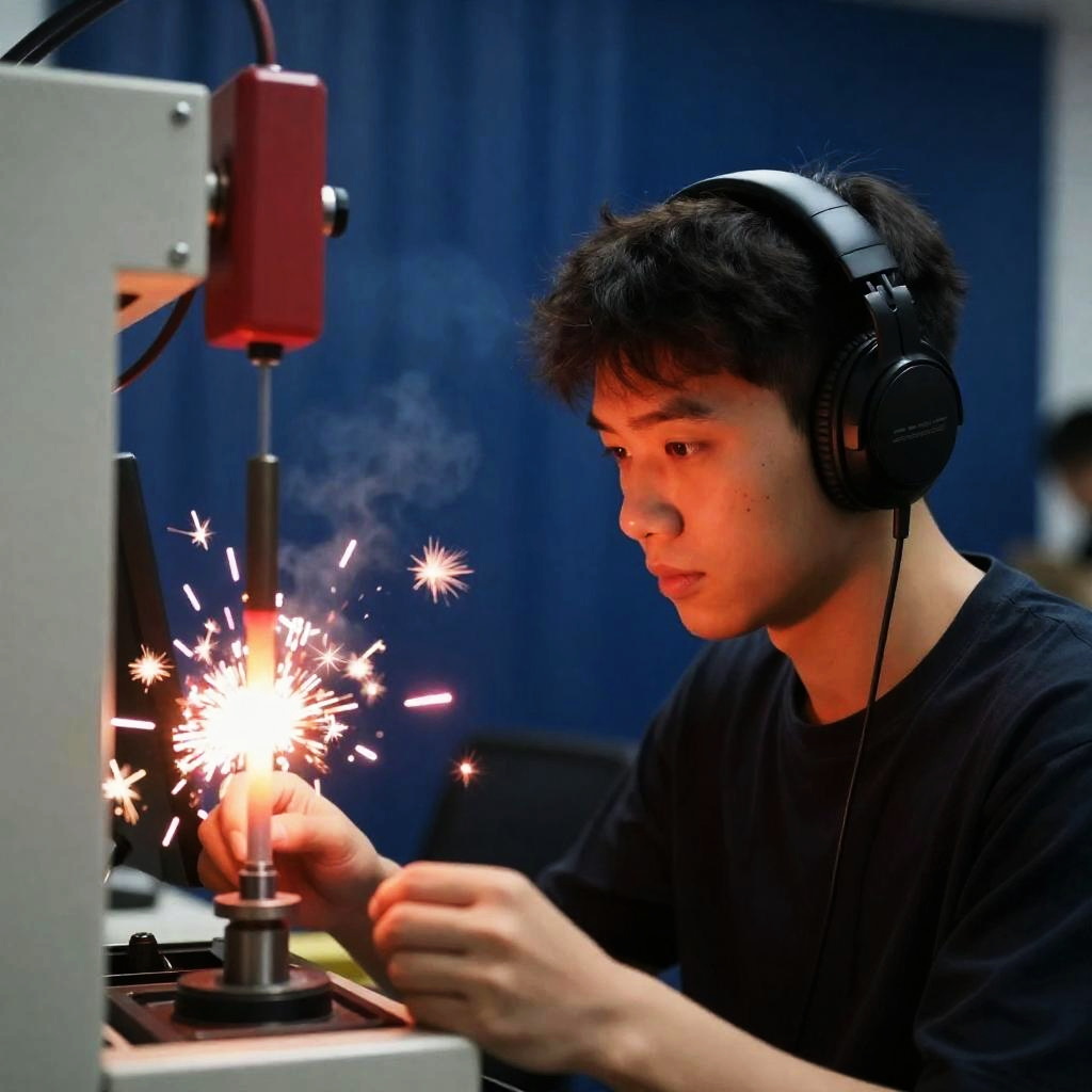 Young man with short dark hair, wearing black headphones and dark shirt, focused expression, sitting at a machine. Machine emits bright red and orange sparks. Machine parts with red and white components hang above. Blue curtain in background.