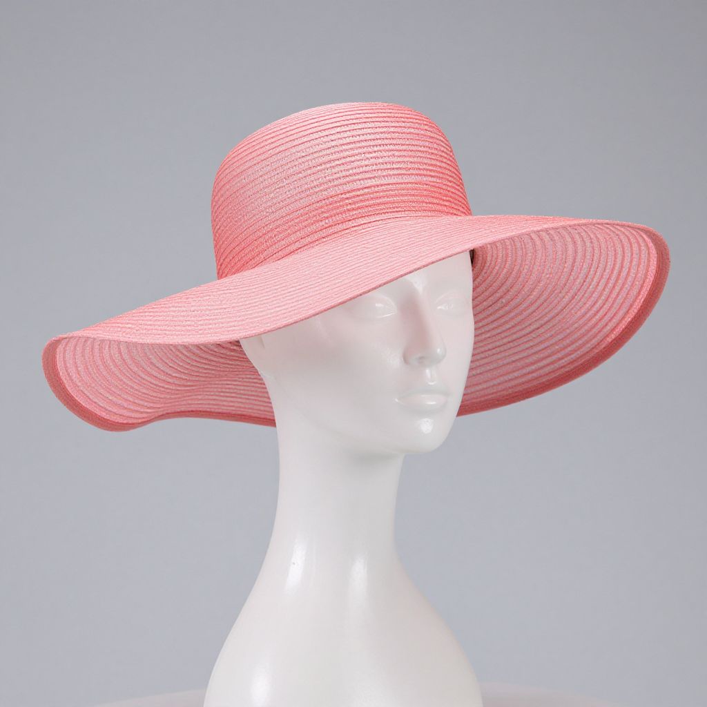Photograph of a white mannequin head wearing a wide-brimmed, pink straw hat with textured bands, set against a plain, light gray