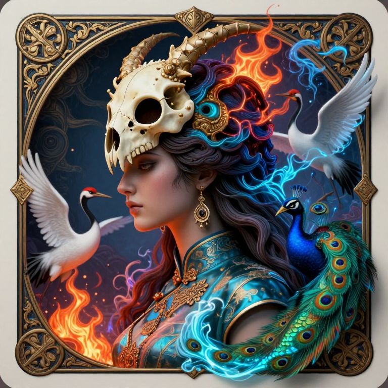 Digital artwork of a woman with a skull helmet, dark wavy hair, colorful flames, peacock feathers, and white birds, framed in ornate