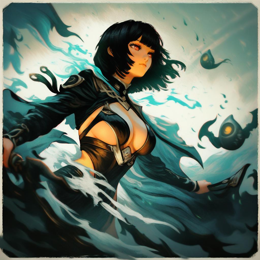 Digital artwork of a fantasy female warrior with short black hair and brown eyes. She is dressed in a dark, stylized outfit featuring a low neckline and metallic details, depicted in dynamic motion with swirling ethereal blue-green waves and mysterious floating orbs in the background. The image reflects a vibrant, anime-inspired style.