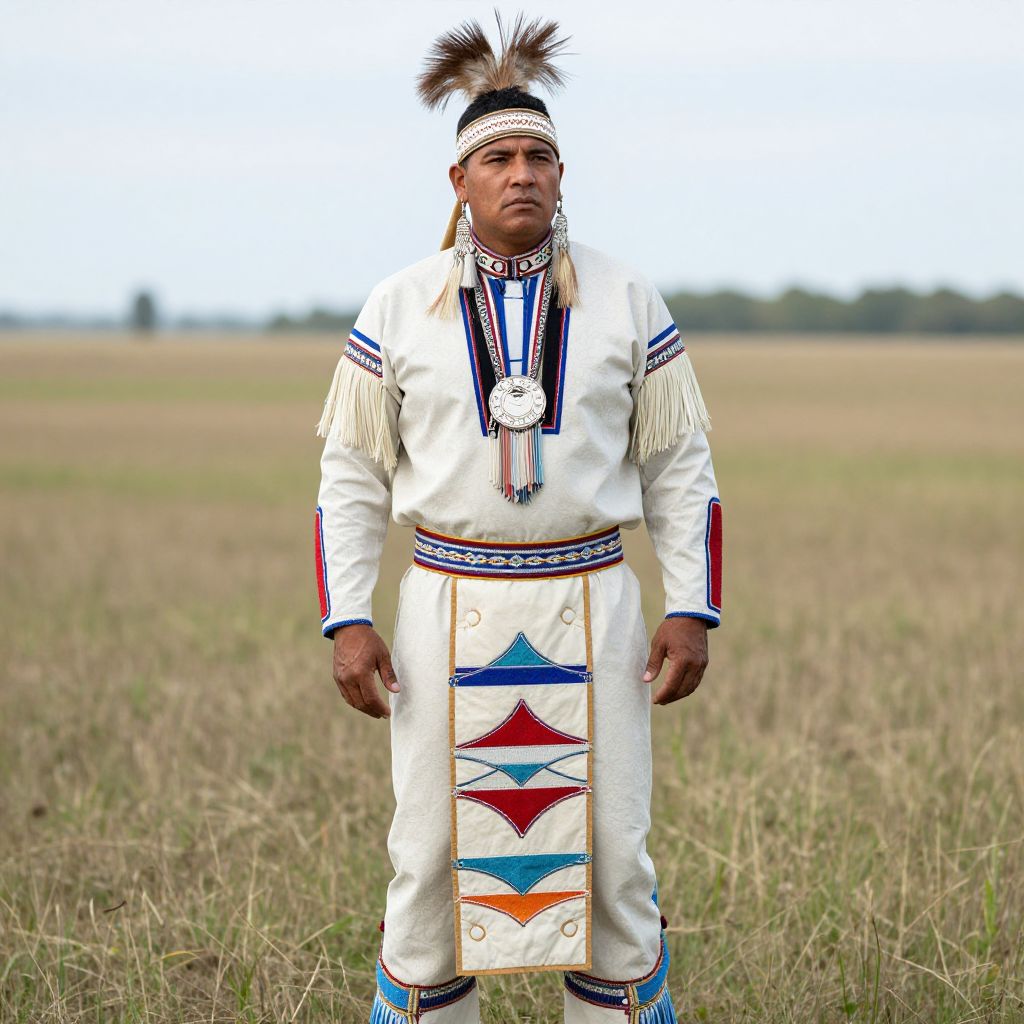 Native American Pow Wow Costume, man in native dress standing in front of a field