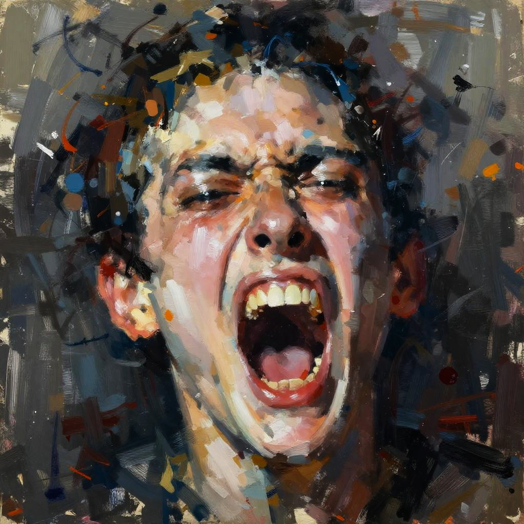Contorted face captured in mid-scream, dynamic brush strokes, abstract expressionism, strong contrasts of light and dark, chaotic background enhancing the emotional turmoil
