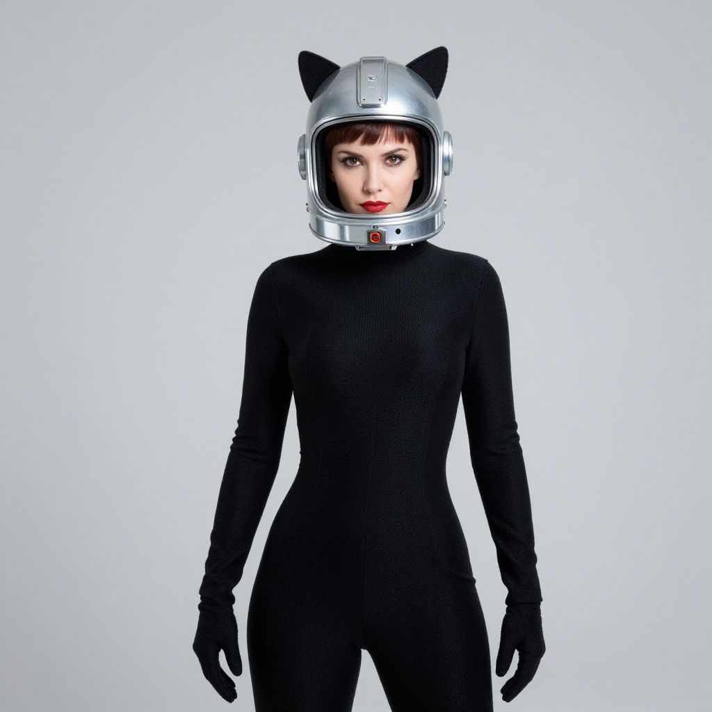 Photograph of a young woman with pale skin and dark brown hair, wearing a shiny silver helmet with black cat ears and a clear visor. She has red lipstick and dark eye makeup. She is dressed in a tight, black, long-sleeved, ribbed catsuit with black gloves. The background is a simple, bright white, creating a stark contrast with her dark outfit. The image has a high-contrast, minimalist style, focusing on the subject's confident, slightly intense expression. The overall aesthetic is futuristic and slightly edgy.