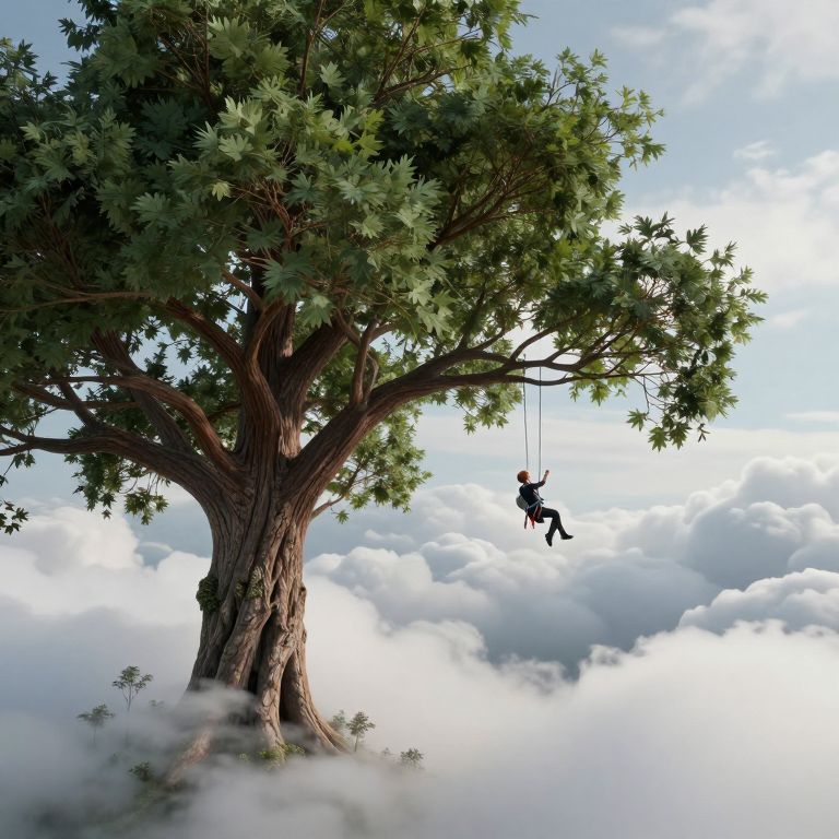 This digital artwork depicts a towering, leafy tree with a thick, textured trunk, set against a backdrop of fluffy, white clouds. A small, silhouetted figure hangs from a branch using a rope, positioned to the right of the tree. The tree's green leaves are detailed and abundant, contrasting with the bright, blue sky and soft clouds below. The scene evokes a sense of whimsy and adventure, with the figure's precarious position adding a touch of suspense. The overall style is realistic with a fantasy element, emphasizing the tree's grandeur and the ethereal quality of the clouds.